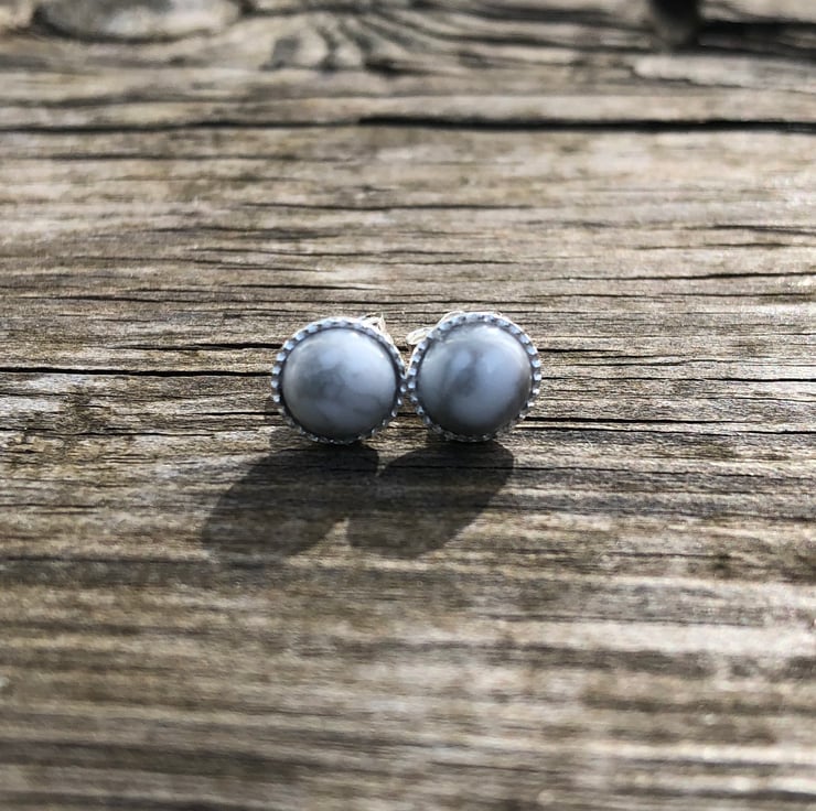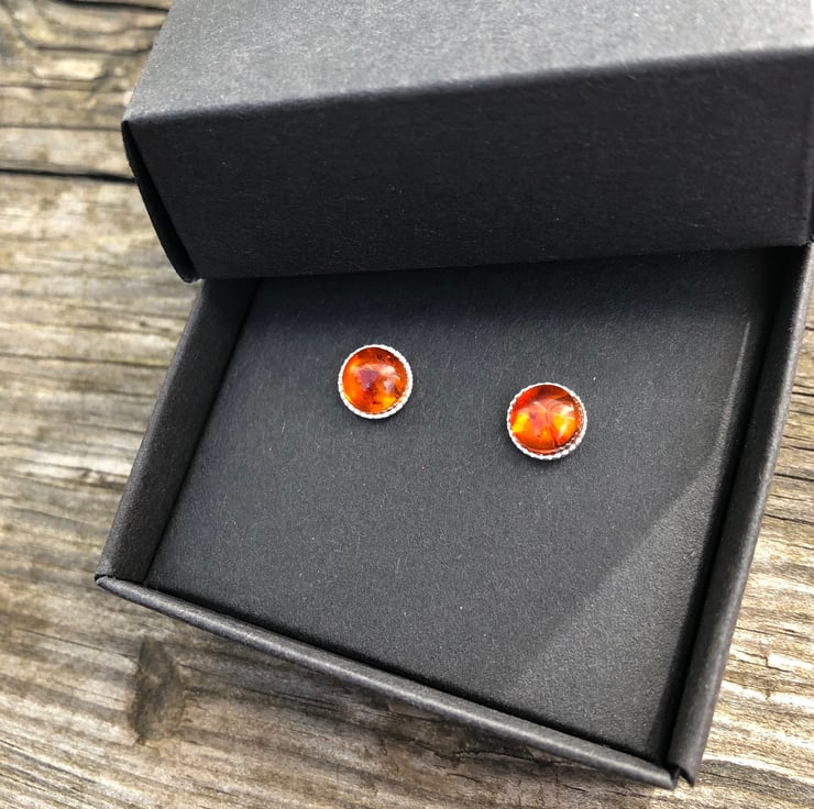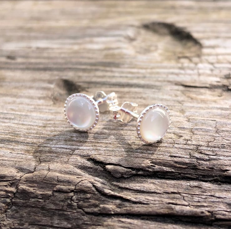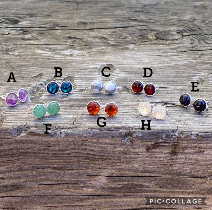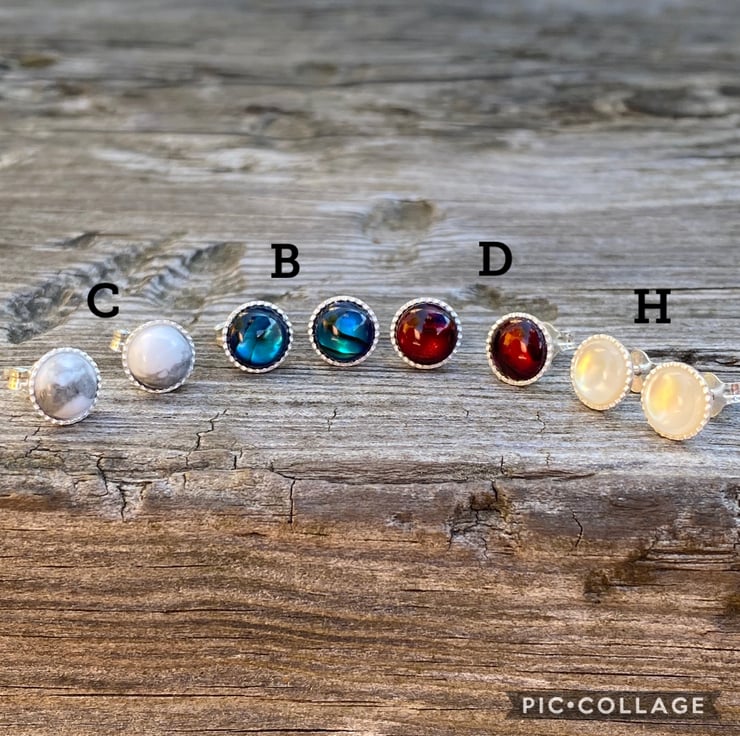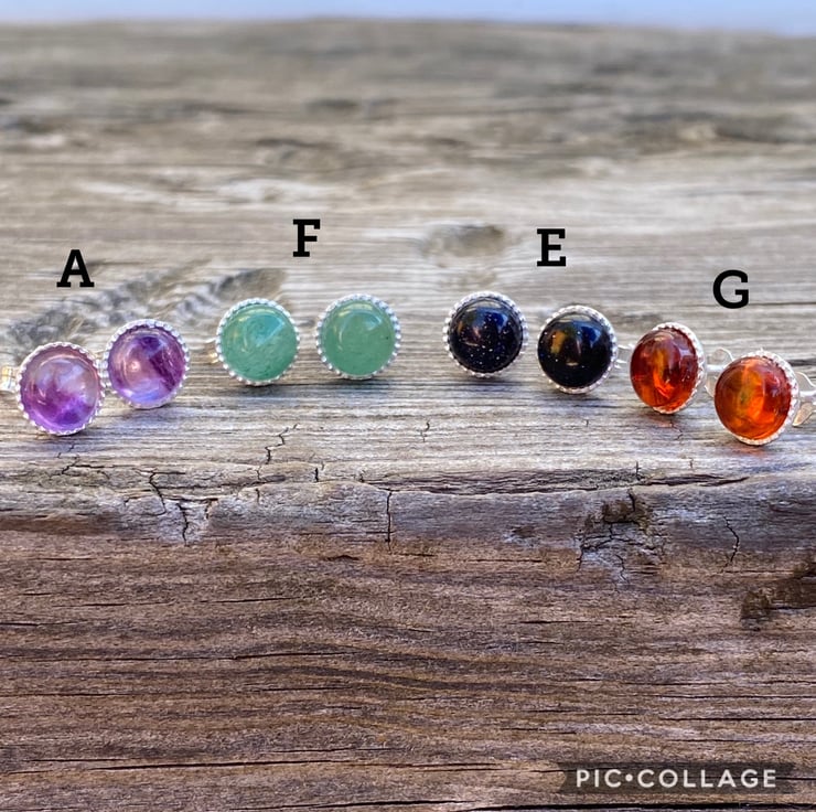 Choose between a range of semi precious cabochon which have been set into 6mm milled edged sterling silver studs, these are fastened with sterling silver scroll backs.