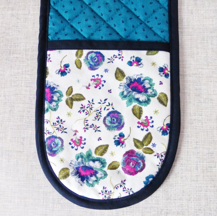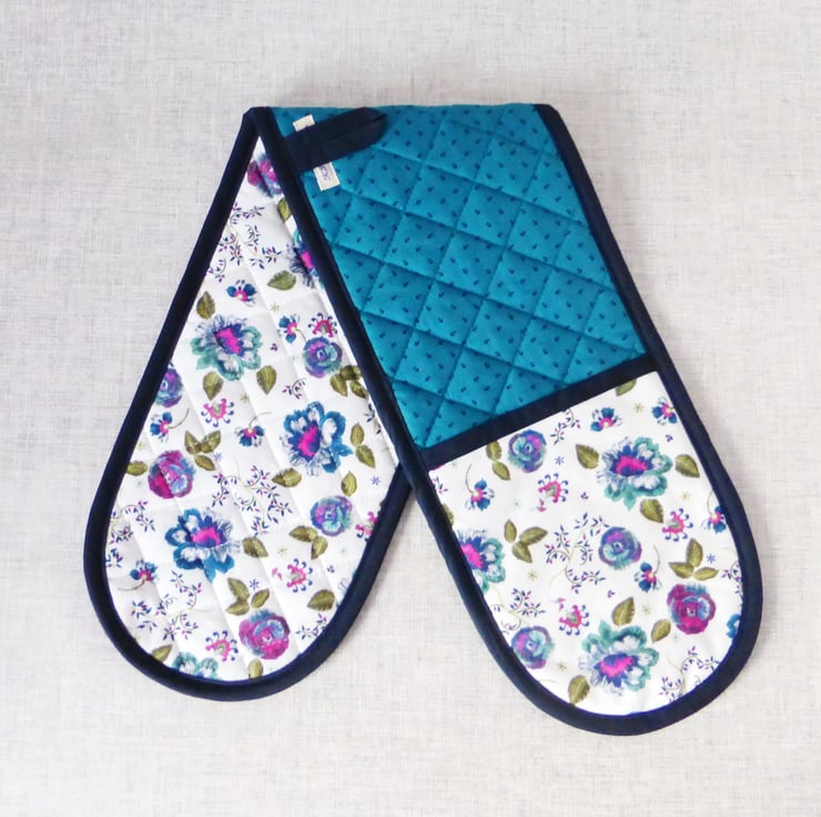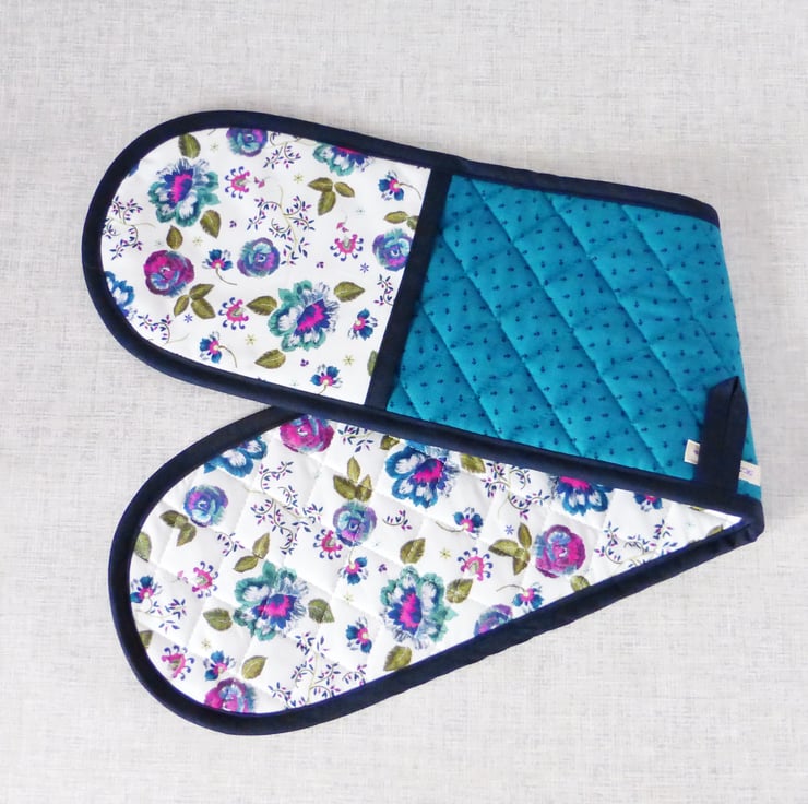 These oven gloves have been made using a lovely floral cotton fabric in shades of blue, teal and pink on a white background, with a contrasting cotton fabric in a teal colour with a small black pattern on it.