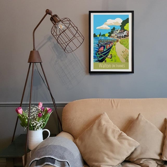 A lovely travel poster print of the view of the Thames riverside, by the Anglers in Walton on Thames, available at A3 or A2, from my own original acrylic painting.
