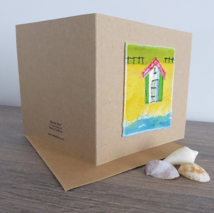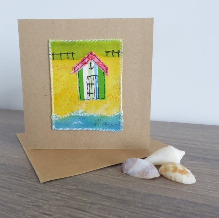 "Beach Hut' - is a handmade textile card which has been created using appliqued pieces of raw edge cotton fabric and free motion embroidery.