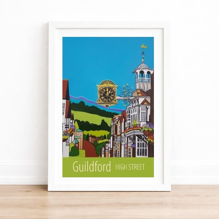 A lovely travel poster print of the view from the top of Guildford High Street, available at A3 or A2, from my own original acrylic painting. A perfect gift for those who love Guildford!