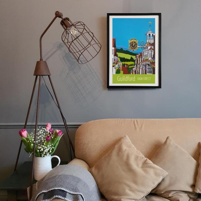 A lovely travel poster print of the view from the top of Guildford High Street, available at A3 or A2, from my own original acrylic painting.