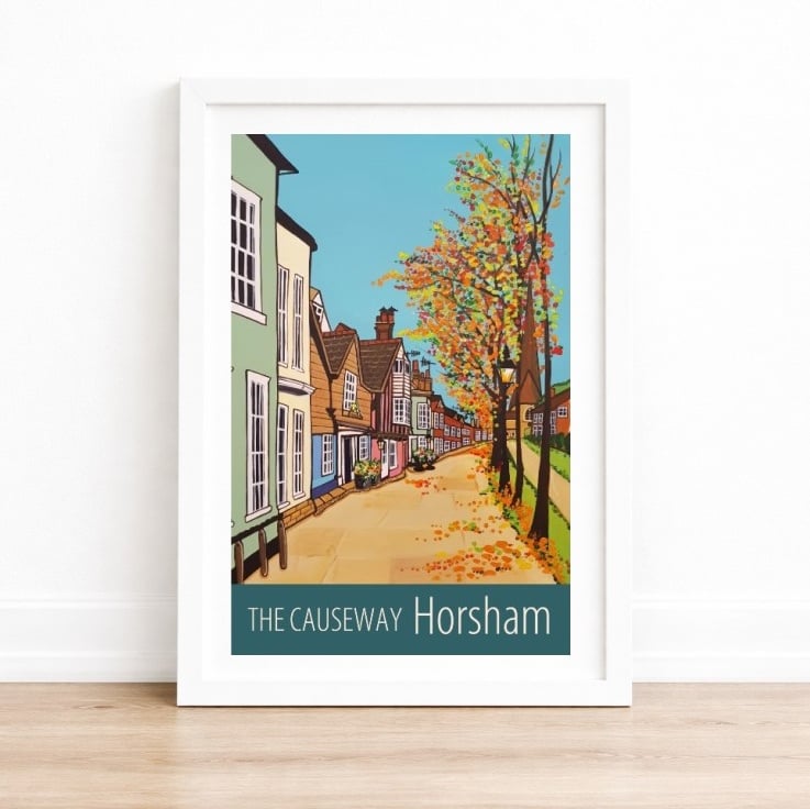 A lovely travel poster print of an Autumnal view of the historic Causeway in Horsham, West Sussex, available at A3 or A2, from my own original acrylic painting. A perfect gift for those who love Horsham!