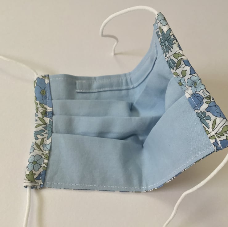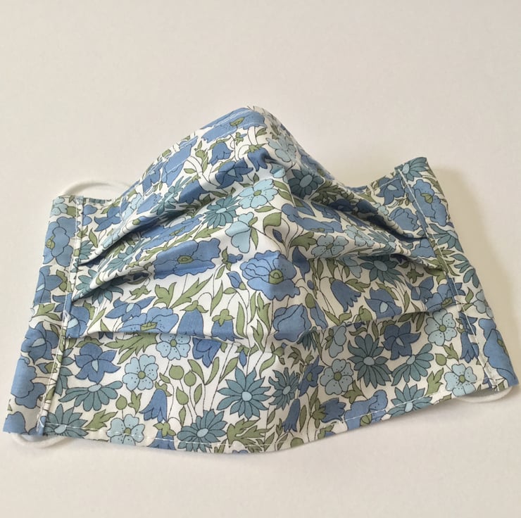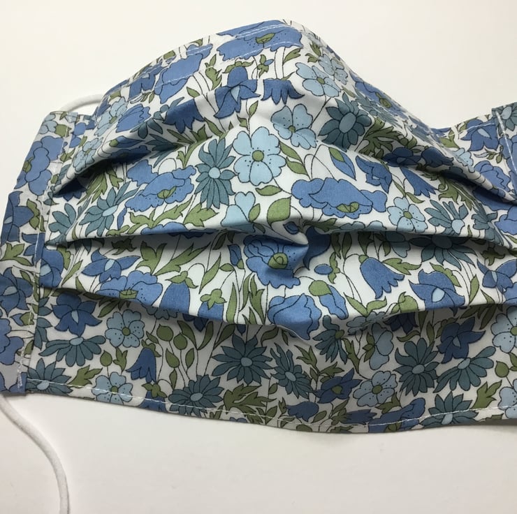 Pleated Liberty’s face Covering with 3 layers, 2 of the layers are Tana Cotton Lawn, a soft fabric with no chemicals, the lining is a Complementary cotton fabric. There is a removable nose wire and elastic ear loops with 30cm each side for you to adjust to size.