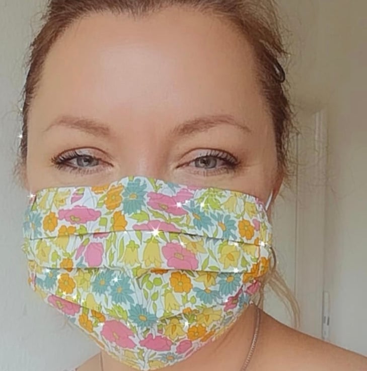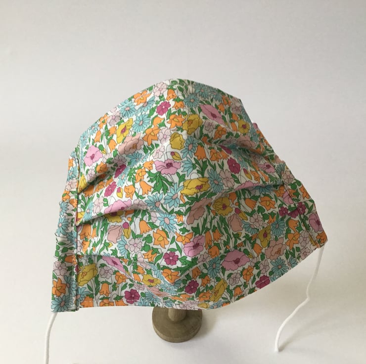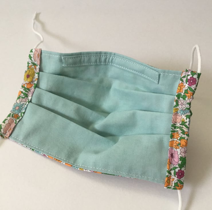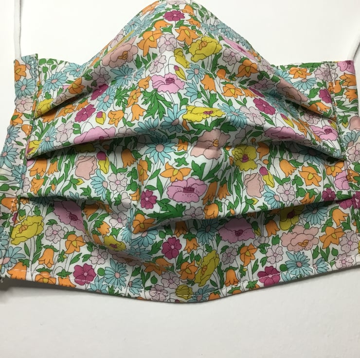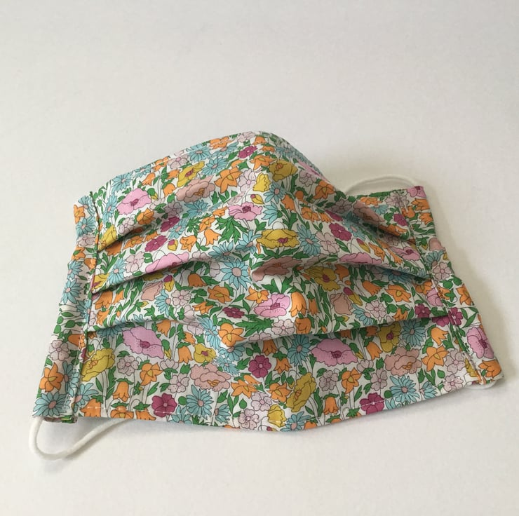 3 Layer Pleated Liberty Fabric Face Covering with removable nose wire and elastic ear loops with 30cm each side for you to adjust to size. The face covering has 3 layers 2 of which are Tana Lawn, a soft cotton with no chemicals and the lining is in a complimentary cotton fabric.