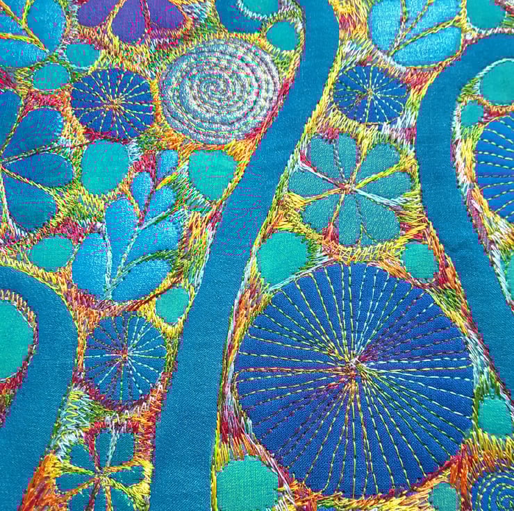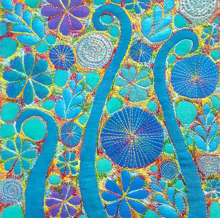 The cover is made from layers of fabric including hand dyed Egyptian cotton and silk fabrics using the free machine embroidery style of sewing