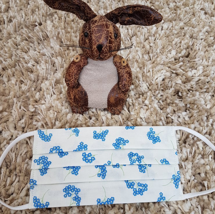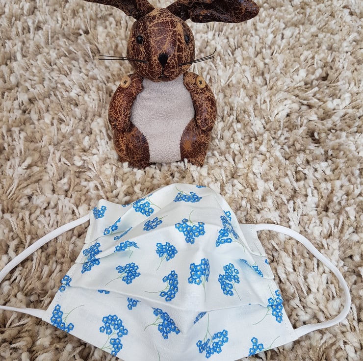Adult face covering/mask made from a forget-me-not print on ivory cotton. The face mask is made with 2 layers of cotton forming an inner pocket for a filter (not included) and is fastened over the ears with 2 loops of elastic and a toggle adjuster.