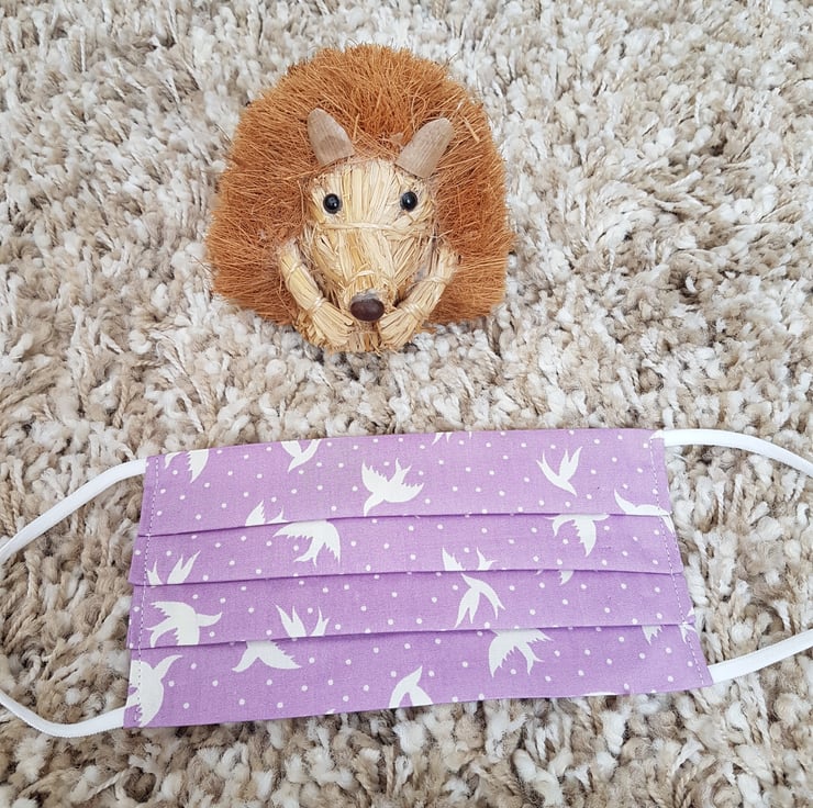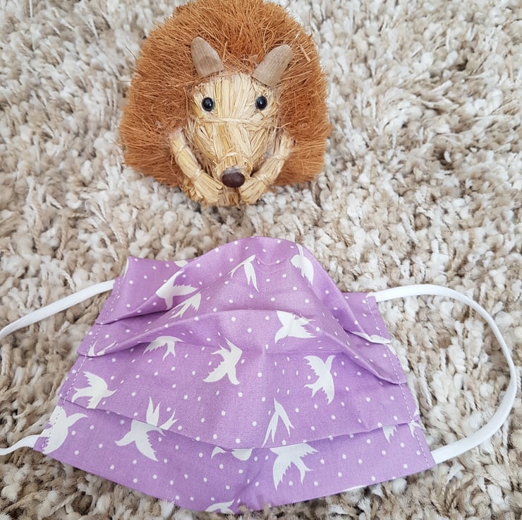 Small Adult/Teenager face covering made from a swift print on lilac cotton. The face mask is made with 2 layers of cotton forming an inner pocket for a filter (not included) and is fastened over the ears with 2 loops of elastic.