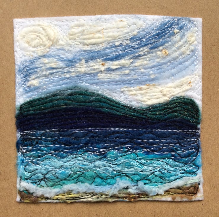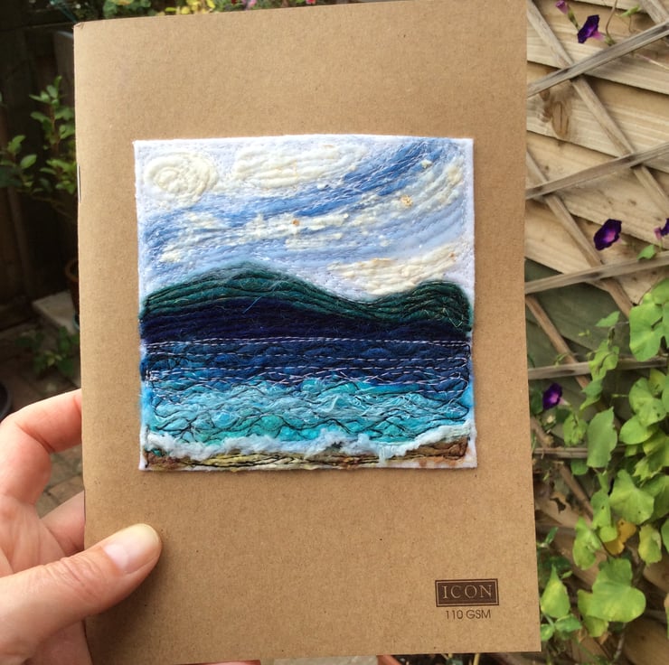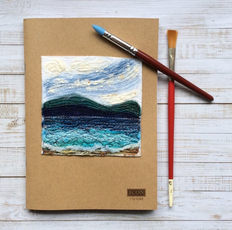 A5 sketchbook with plain 110 gsm paper and an embroidered brown card cover. It’s enhanced with a beautiful needle felted seascape with free motion embroidery. It’s ideal for drawing, journaling, scrapbooking, painting or doodling. It’s also handy for pockets or bags. The stapled sketchbook is made from paper and black card, measures 15 x 21cm, contains 40 pages (80 sides). The artwork measures 11 x 11 cm.