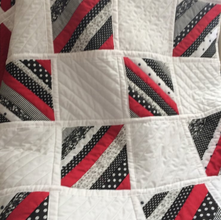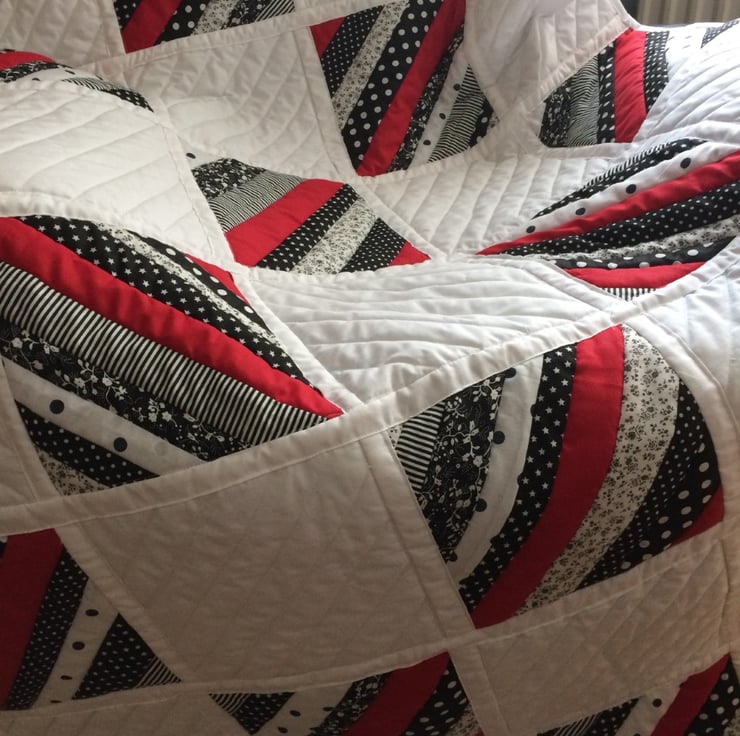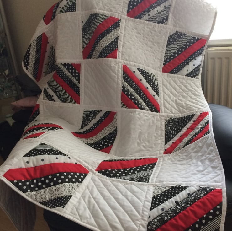 Machine Quilted strip quilts in Red white and black prints with plain white cotton back and binding