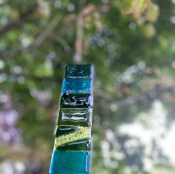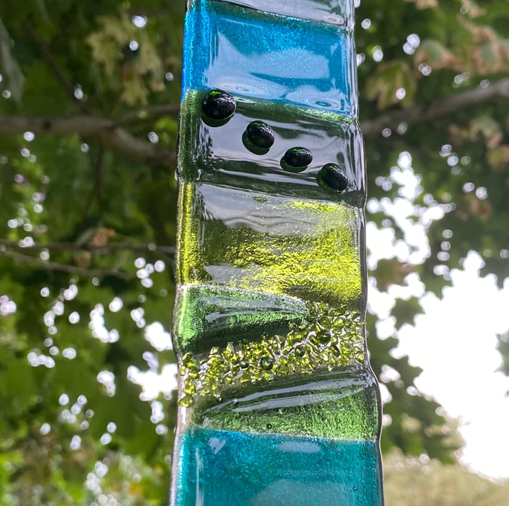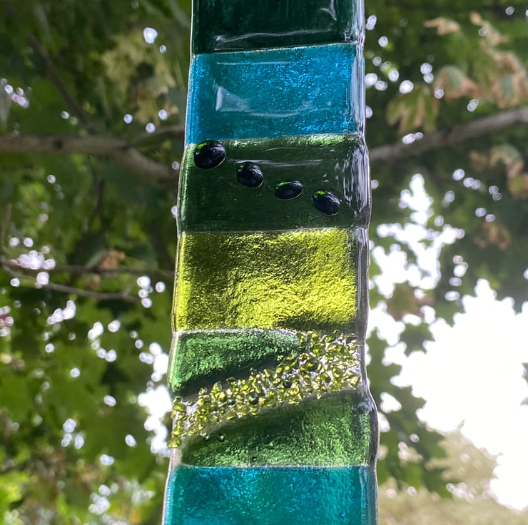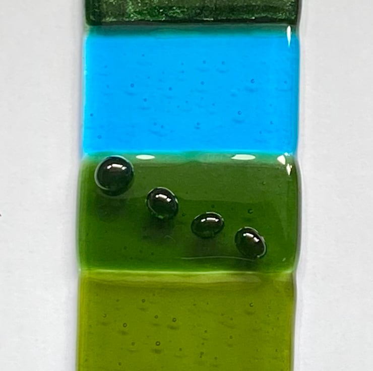 Shades of green and turquoise glass have been stacked onto a clear glass base before a first firing in the kiln. Then tiny shapes of green glass have been added to embellish while still allowing the light to shine through. A second firing in the kiln secures these in place on the glass.