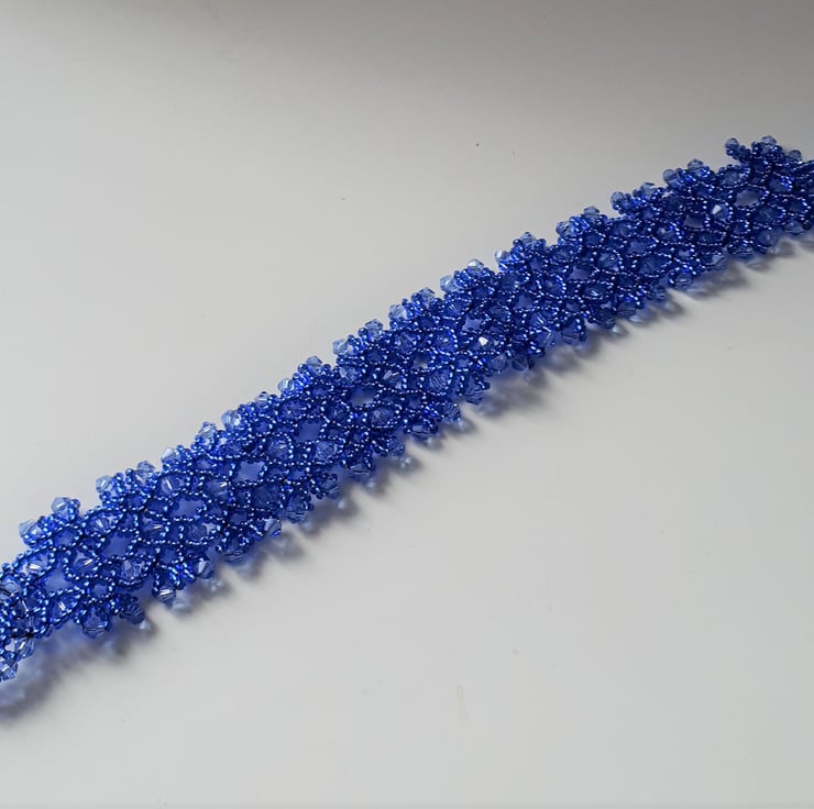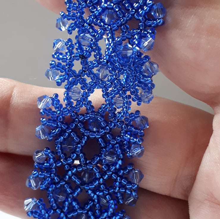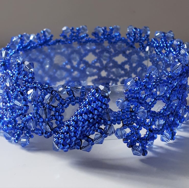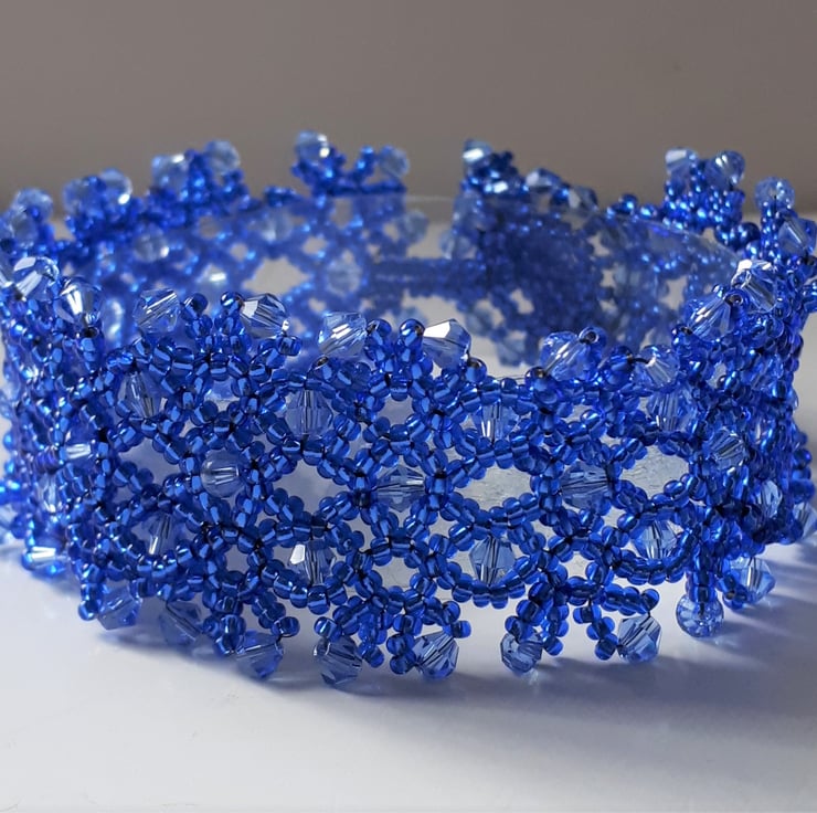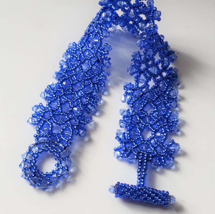 This lovely bracelet is made with silver lined blue seed beads, and small blue bi-cone crystals bead woven into a lacy design. It fastens with a beaded loop and toggle clasp, so has no metal in it, so is great for anyone with an allergy to metal. Sized to fit a 7.25”/18.4cm wrist and is approx. 1”/2.5 cm wide. Based on a design by Jaycee.