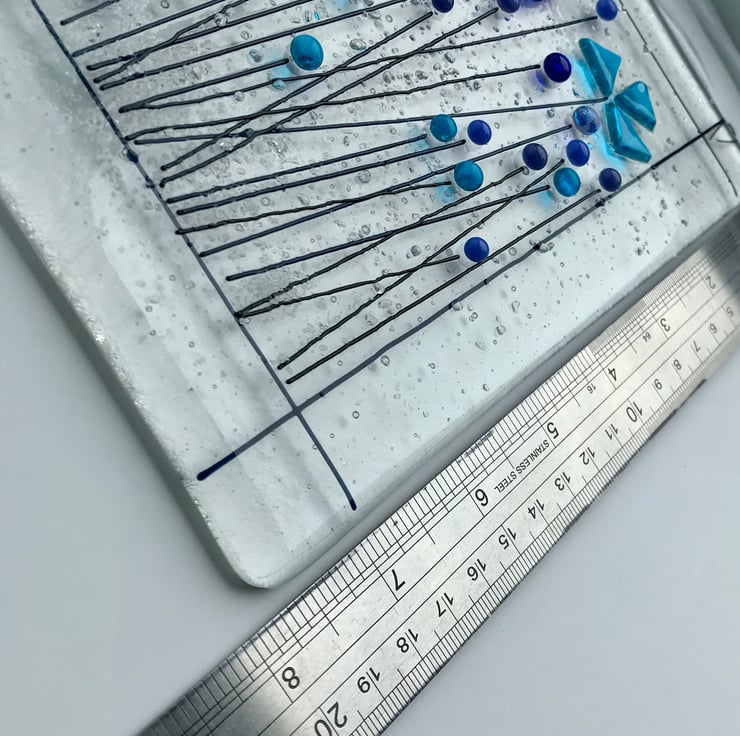 It is approximately 20cm in height and 14 cm in width. It is made from two hand cut glass which are fully fused before a third layer of glass, forming the flower details, is tack fused on top.