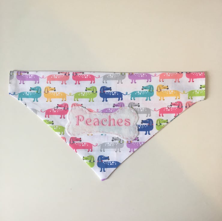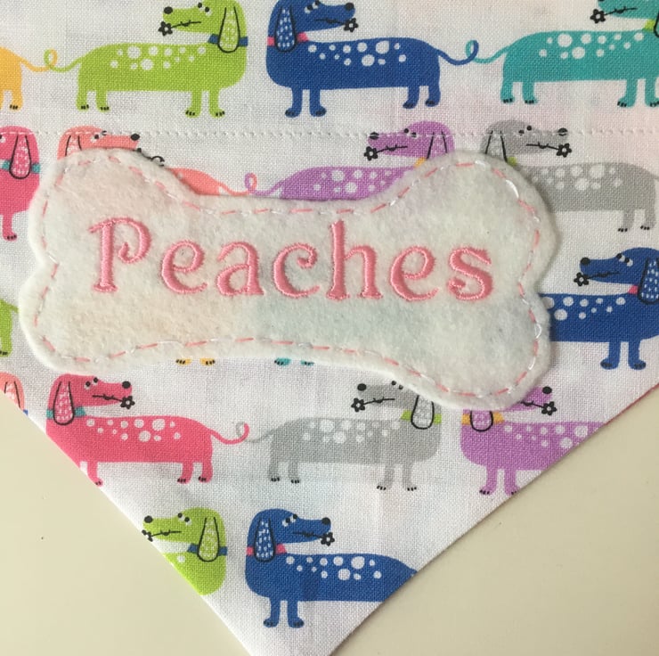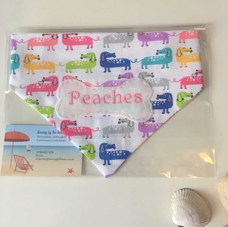 One multi colour dogs and personalised with name ‘Peaches’ for a small dog