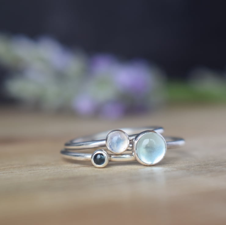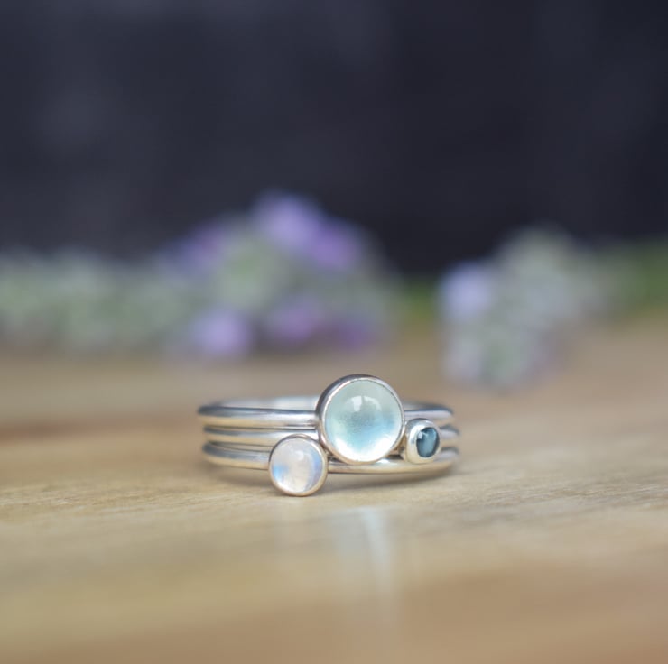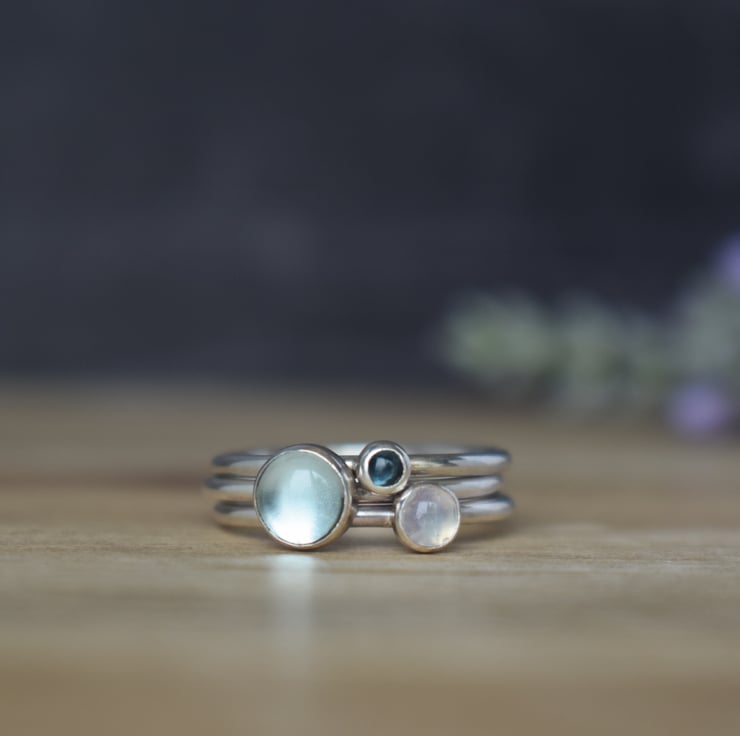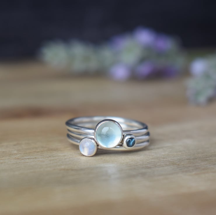 A set of three handmade sterling silver stacking rings inspired by the meeting of freshwater streams and the deep blue seas along the Lincolnshire coast of my childhood home. Stones of Sky Blue Topaz, Rainbow Moonstone and London Blue Topaz are paired together in this watery mix. As they are separate rings, you can choose to wear on their own, or in any combination as you prefer.