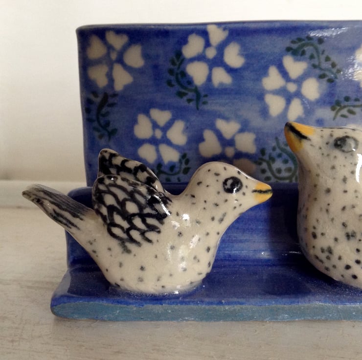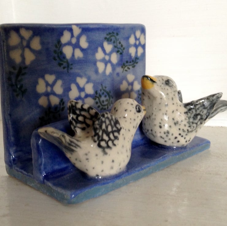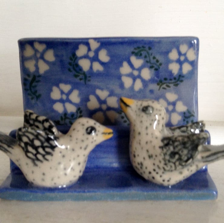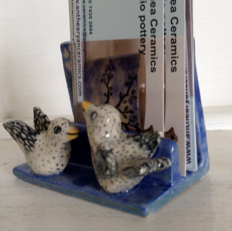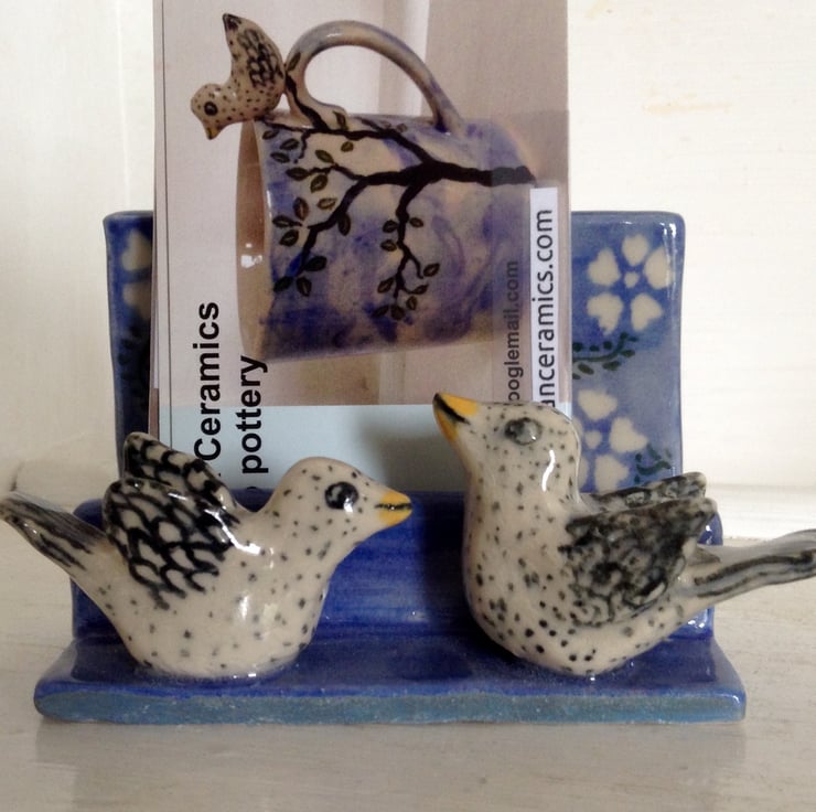 Cheer up the office desk with this very pretty handmade business card holder in stoneware clay. It has 2 little hand sculpted birds on the front and and is decorated with white flowers and green leaves on a blue background. It has a clear glossy glaze and measures 8.5 cms x 4.5 cms and the back is 6 cms high. It holds about 30 average business cards.