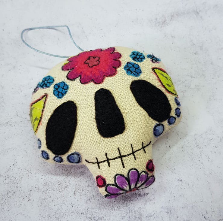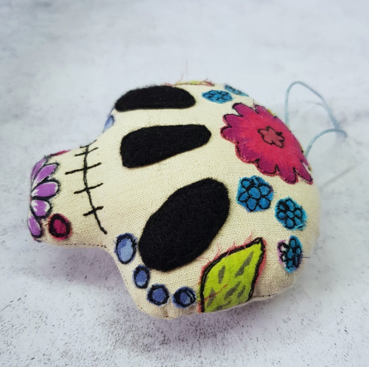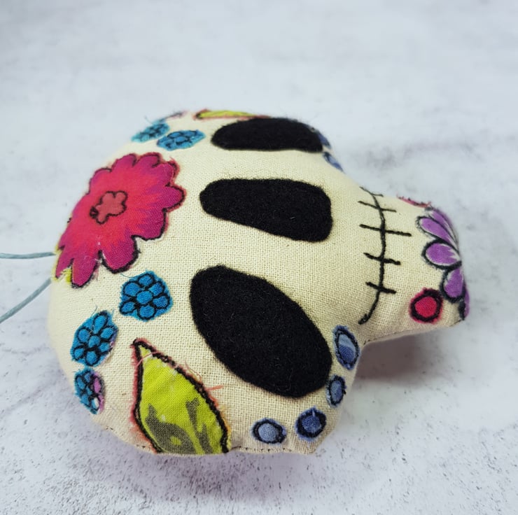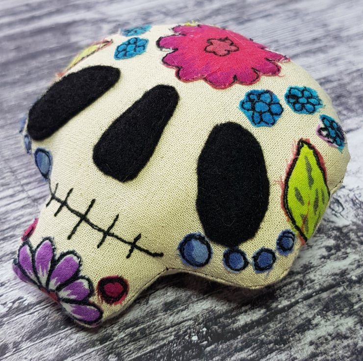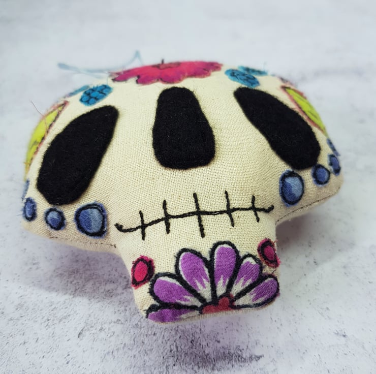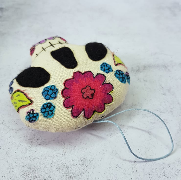 This candy skull is decorated with free motion embroidered flowers, leaves and dots from upcycled fabric. Would make a wonderfully quirky and handmade addition to your halloween or day of the dead themed decor. Listing is for one sugar skull, shown on first picture. Measures roughly 9cm tall by 9cm across.