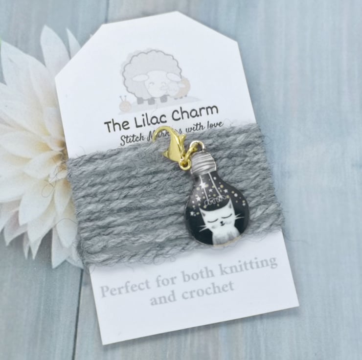 Gorgeous Cat and Stars light bulb charm Stitch Marker. The charm has a detailed night time scene...complete with stars and an adorable white cat. Perfect for knitting and crochet.