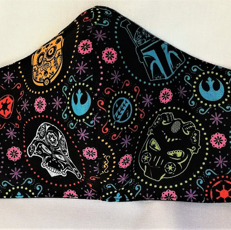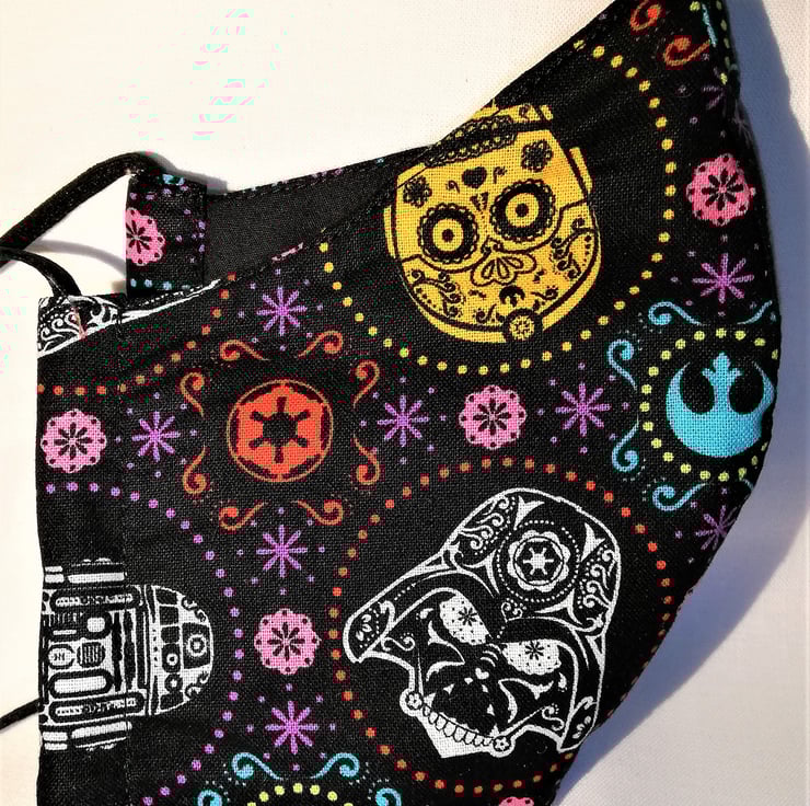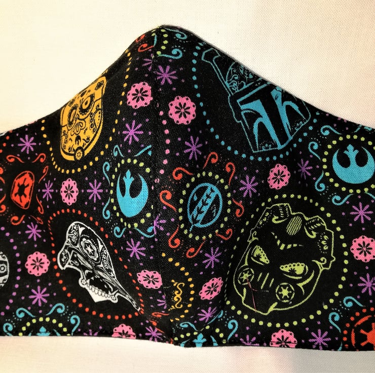 Hand made 100% cotton triple layer face mask. Reusable and washable with a nose wire that can be removed prior to washing. This is made with 3 layers of cotton. The outside layer is black printed with a star wars style sugar skull design. The other 2 layers are both a plain black cotton.