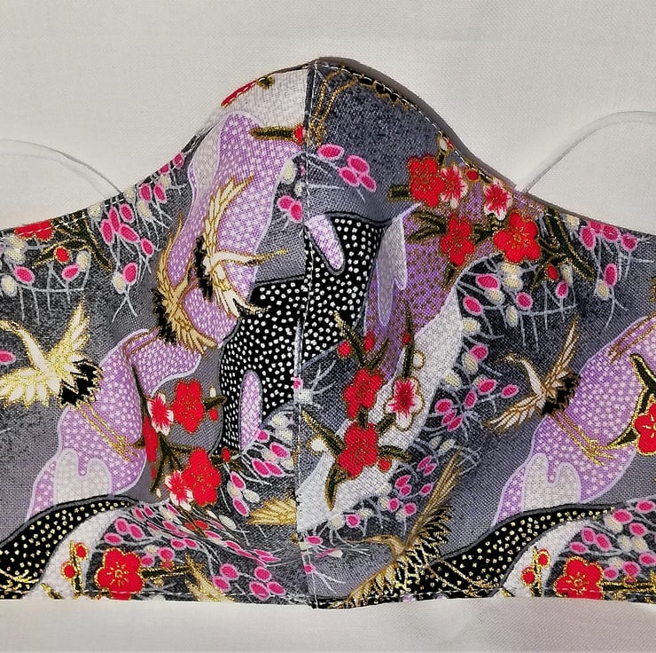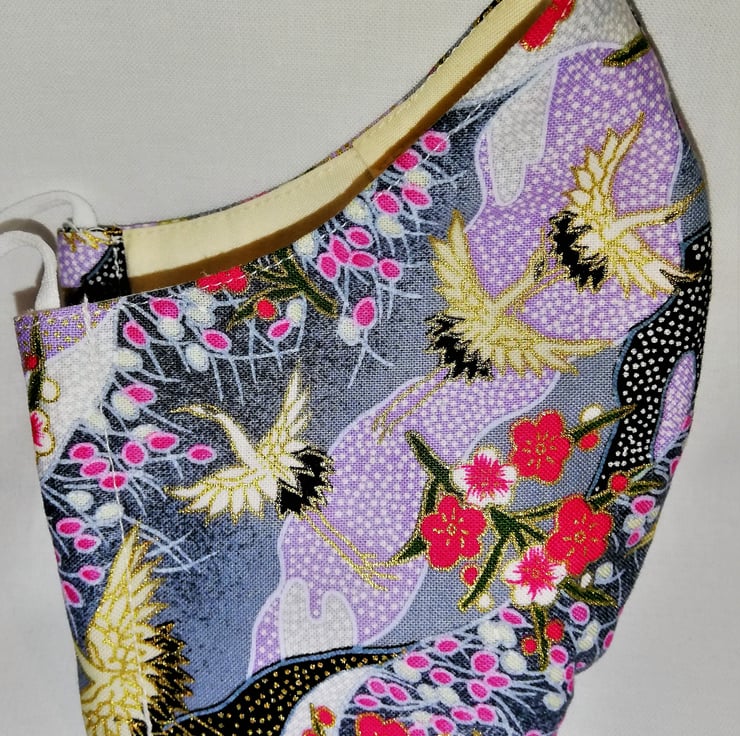 Hand made 100% cotton triple layer face mask. Reusable and washable with a nose wire that can be removed prior to washing. This is made with 3 layers of cotton. The outside layer is Japanese style print with cranes and flowers. The other 2 layers are both a plain cream cotton.