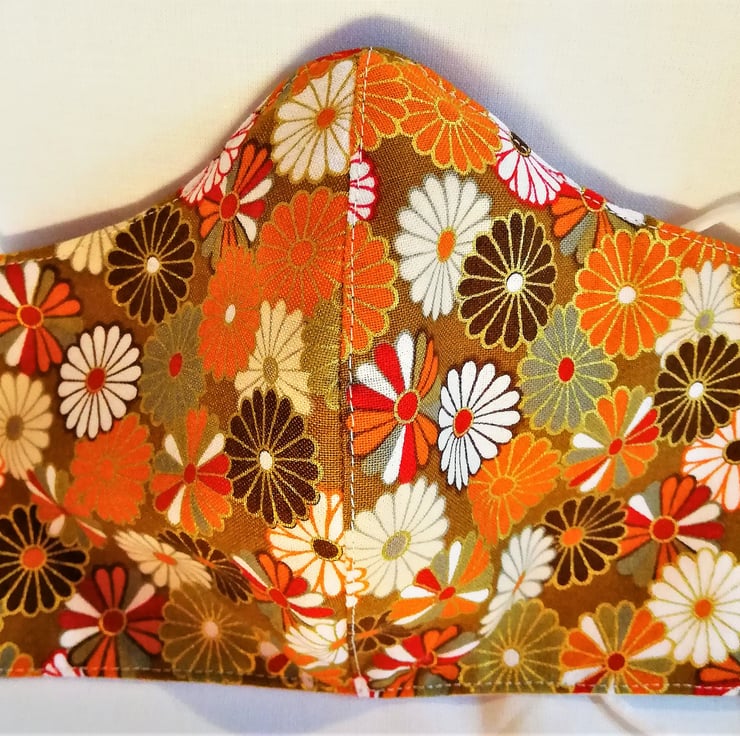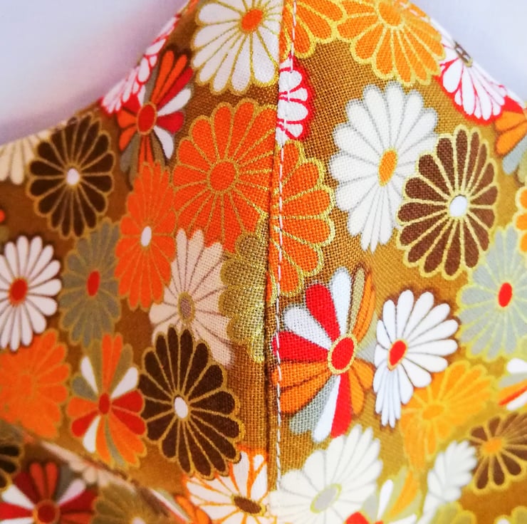 Hand made 100% cotton triple layer face mask. Reusable and washable with a nose wire that can be removed prior to washing. This is made with 3 layers of cotton. The outside layer is a cotton fabric with Japanese design of flowers in oranges, browns and white. The other 2 layers are both a plain cream cotton.