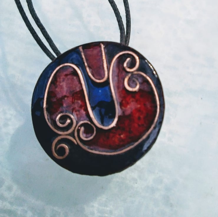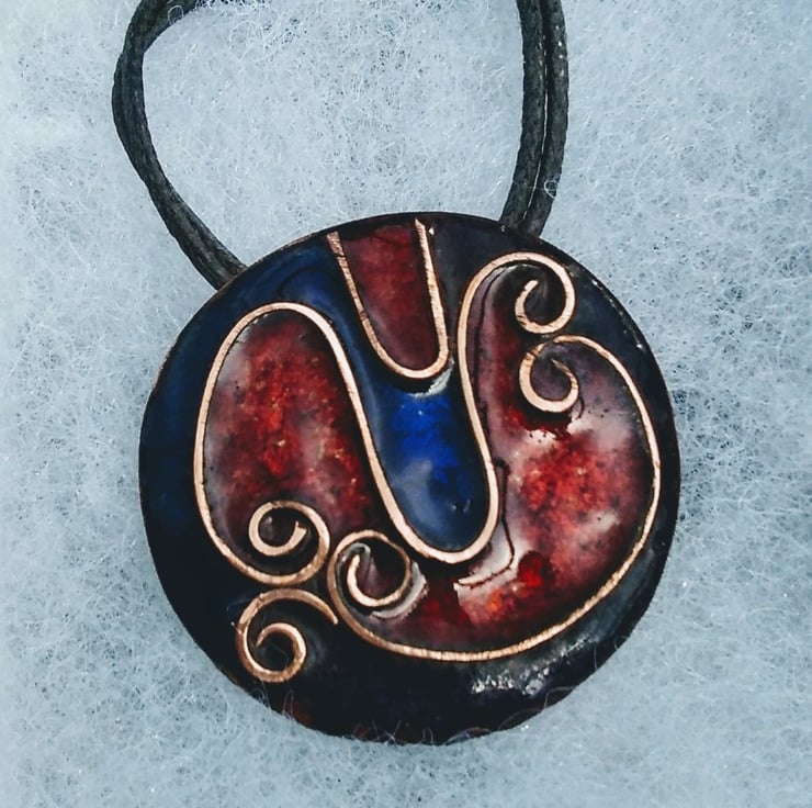 This lovely pendant measures 25mm in diameter. Hand made from start to finish, the process is labour intensive. After cutting out the copper disc, I fire a clear enamel onto it, I use fine copper wire which is shaped randomly, glued onto the disc and fired again to 800 degrees C. With the wires fused into the enamel I add the coloured enamels one by one into the cells and fire again up to 3 times. I add crystals, re-fire. I grind the wire down and re-fire. I solder a piece of copper onto the back to house the waxed cotton thread and clasp. The overall measurement of the necklace is about 17 ins. All done!