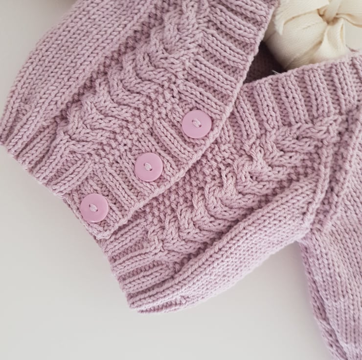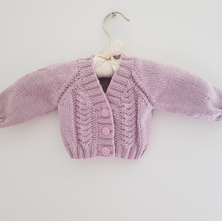 This beautiful baby cardigan has been hand knitted using baby yarn which has a 50% cotton content. it is soft and cuddly plus it is machine washable.