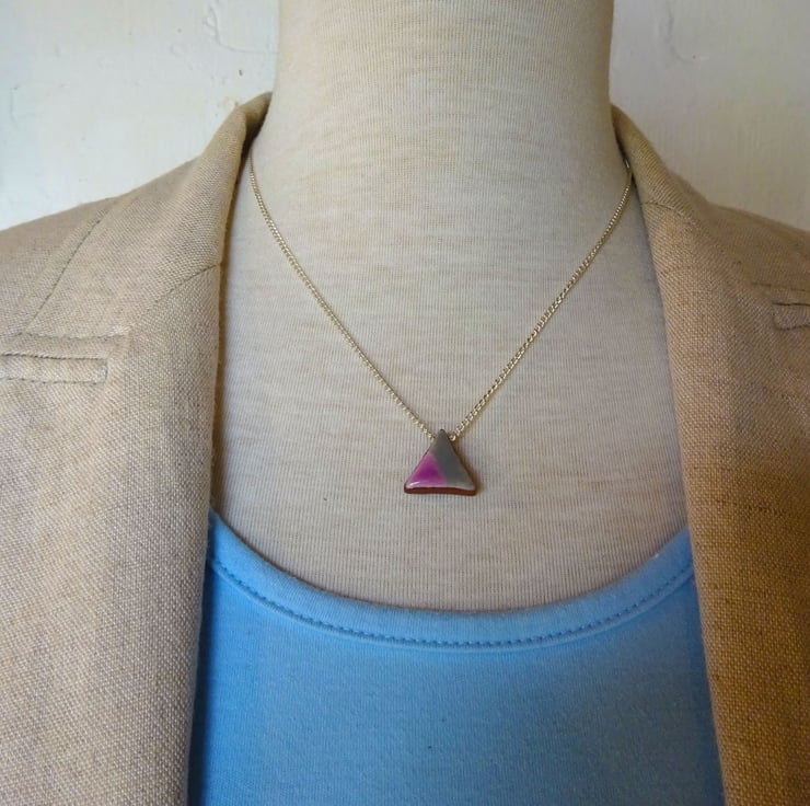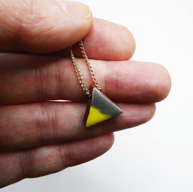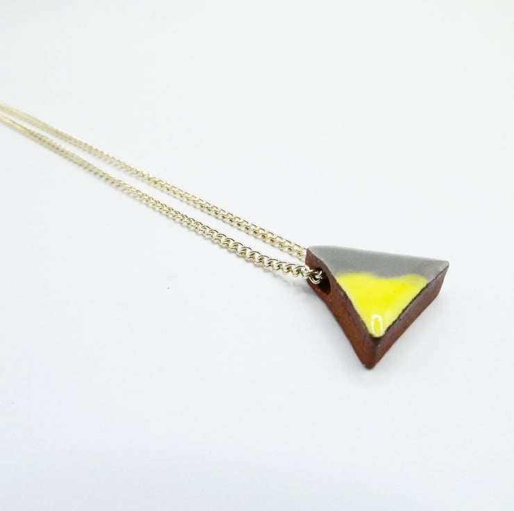 Triangular pendent necklace made from a deep red terracotta clay and glazed on one surface in yellow and grey asymmetric design. The pendant has a hole through the ceramic so that the pendant hangs directly from the chain to give a clean modern look. The chain is a silver plated 16 inch curb chain with a spring ring fastener.