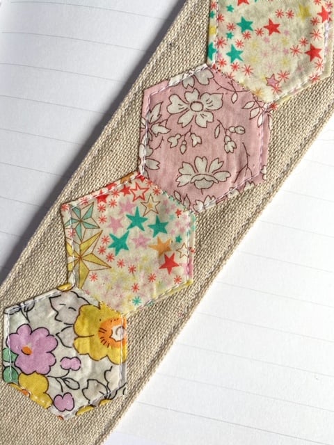 A linen bookmark decorated with 4 'hexies' made of Liberty fabric. Perfect as a gift for book worms or perhaps just a treat for yourself. The reverse side of the bookmark is plain linen and fabric is interfaced for a long lasting, high quality finish.