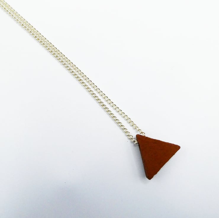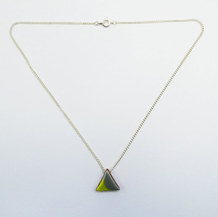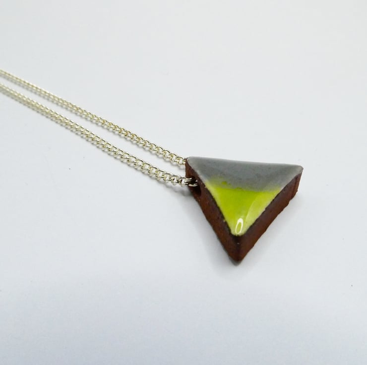 Triangular pendent necklace made from a deep red terracotta clay and glazed on one surface in lime green and grey asymmetric design. The pendant has a hole through the ceramic so that the pendant hangs directly from the chain to give a clean modern look. The chain is a silver plated 16 inch curb chain with a spring ring fastener.