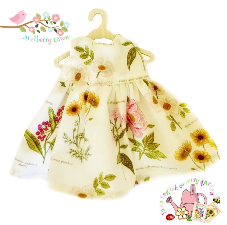 A beautiful little cream dress with a botanics print to fit the Mulberry Green characters. The dress is made from best quality cotton, has a full skirt and a lined bodice and is part of the English Country Garden collection. It comes on a cute little wooden hanger.
