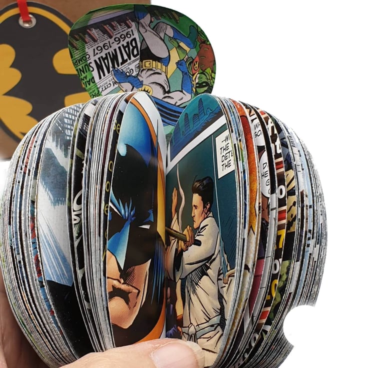 The Apple is made from Marvel comic book pages to give a 3d effect and it stitched together with a zig zag stitch.