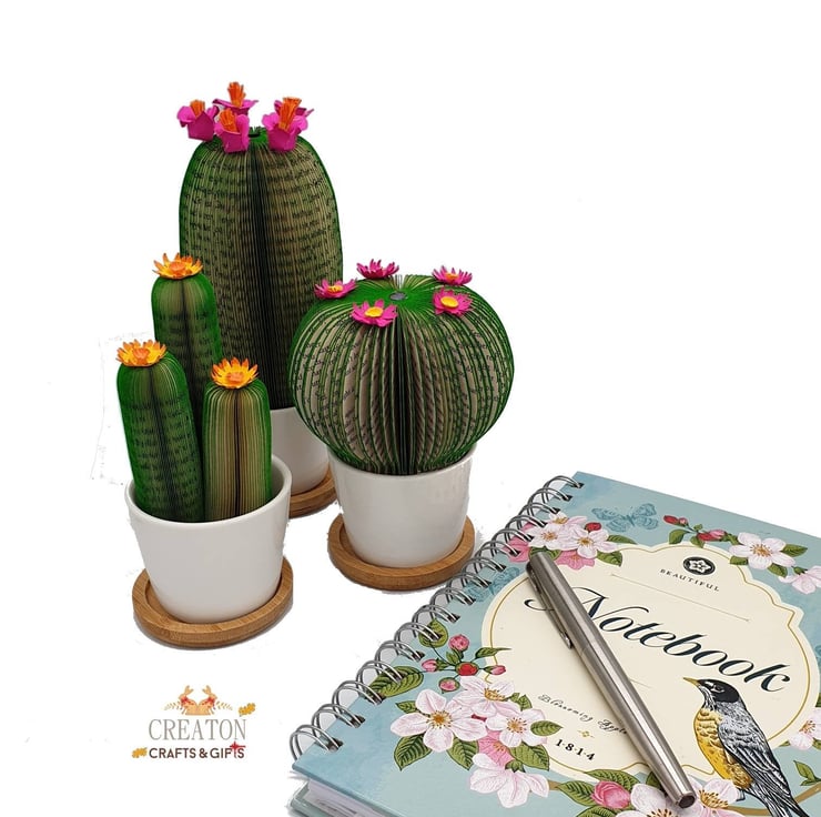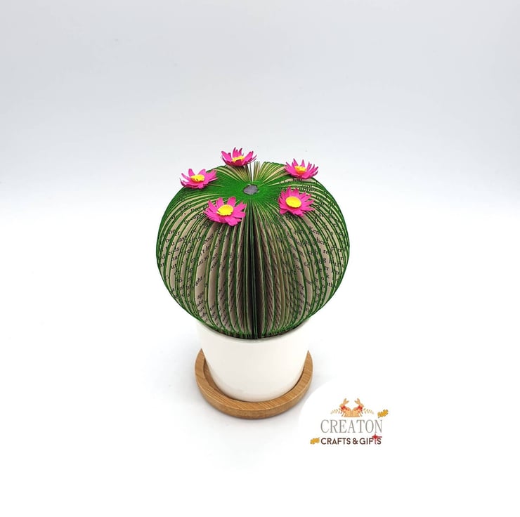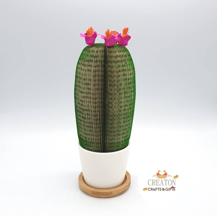 Cactus made from a book, each one has individual paper flowers on top, a choice of 3 different styles to choose from, has a ceramic pot with a bamboo base, each one comes in its own presentation box, great for a: 1st anniversary (paper), a birthday gift, a Cactus fan, as a desk buddy or just because you like it.