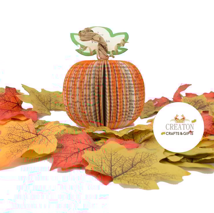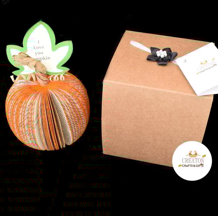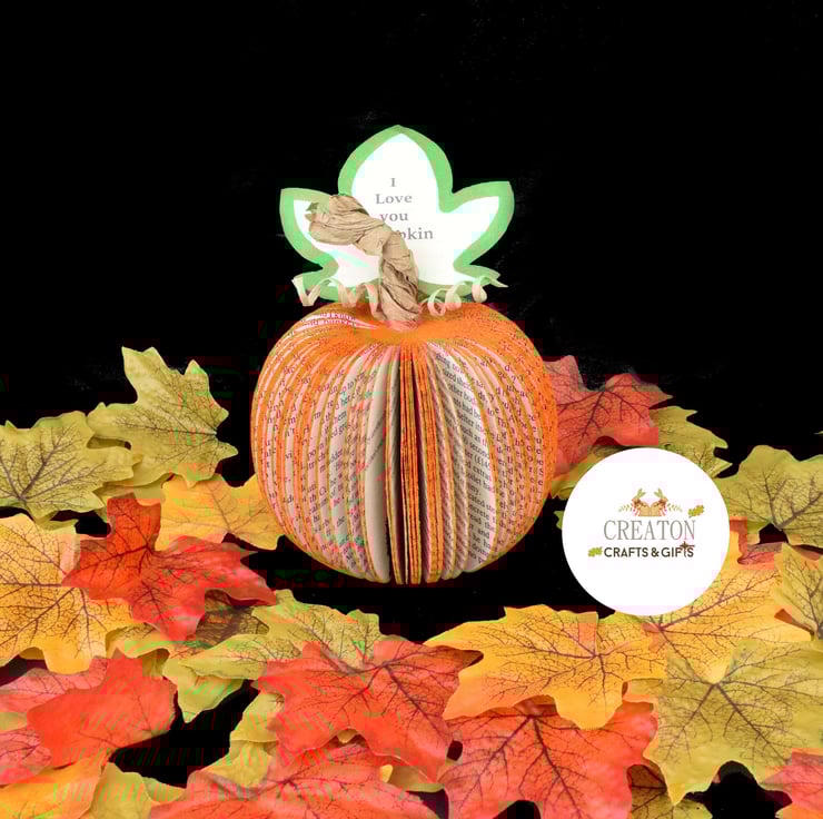 A pumpkin made from a book with a leaf that is personalised with your own words and comes in its own presentation box, great for an autumn anniversary, 1st anniversary (paper), a 4th wedding anniversary which is fruit (technically a pumpkin is a fruit ) or decorating a fall wedding table, a birthday gift or just because you like it.