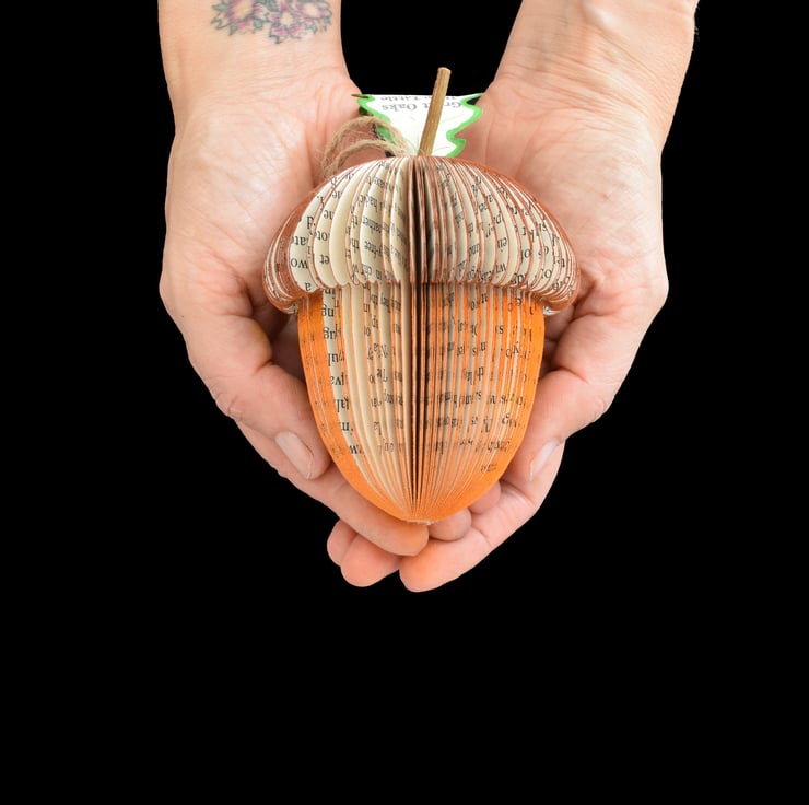 An acorn made from a random book with an oak leaf personalised with your own words.