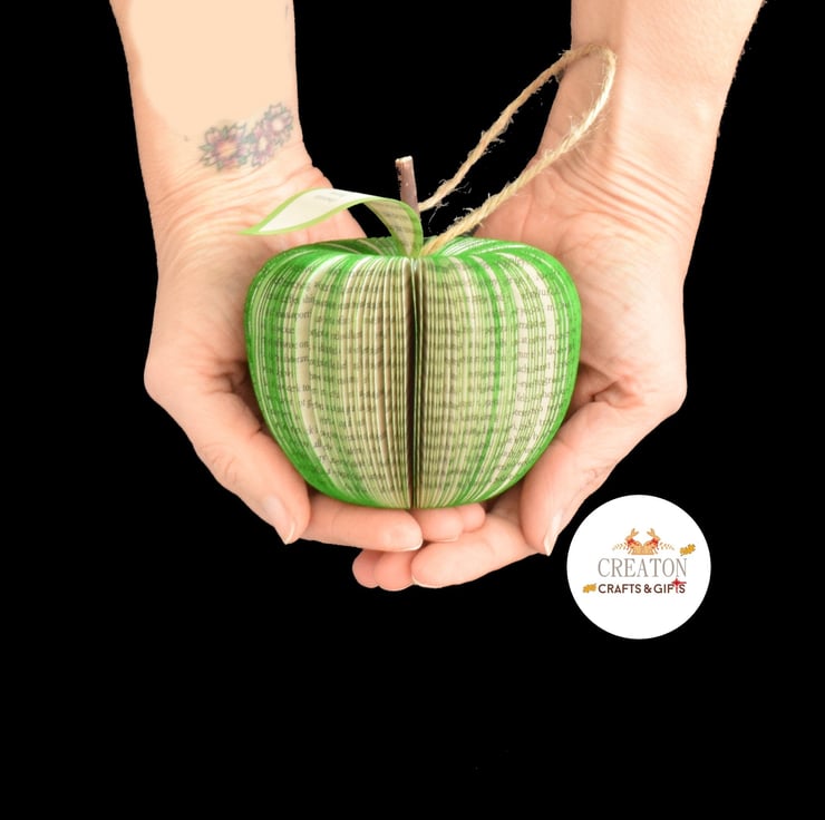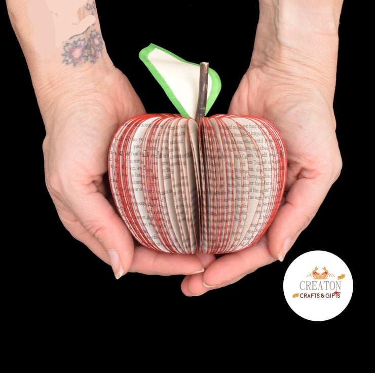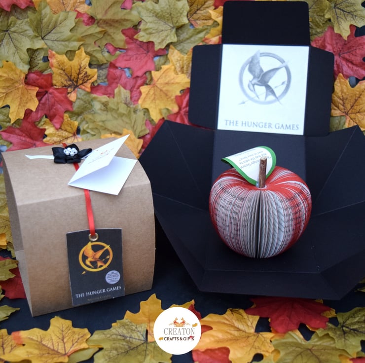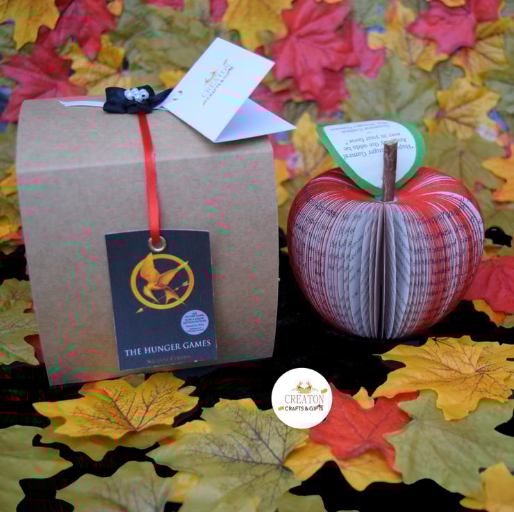 Beautiful Book Apple made from Suzanne Collins - The Hunger Games series Book with a leaf for you to personalise with your own message.