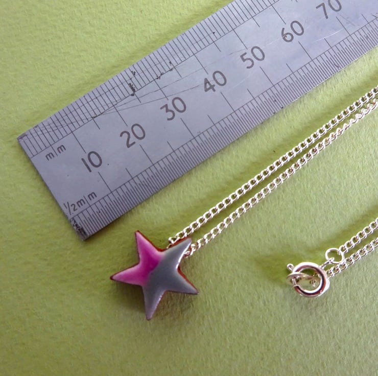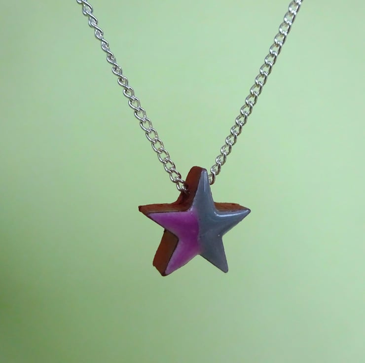 Star shaped pendent necklace made from a deep red terracotta clay and glazed on one surface in purple and grey asymmetric design. The pendant has a hole through the ceramic so that the pendant hangs directly from the chain to give a clean modern look. The chain is a silver plated 16 inch curb chain with a spring ring fastener.