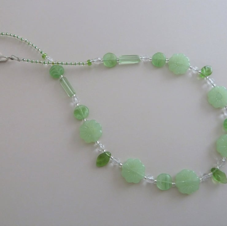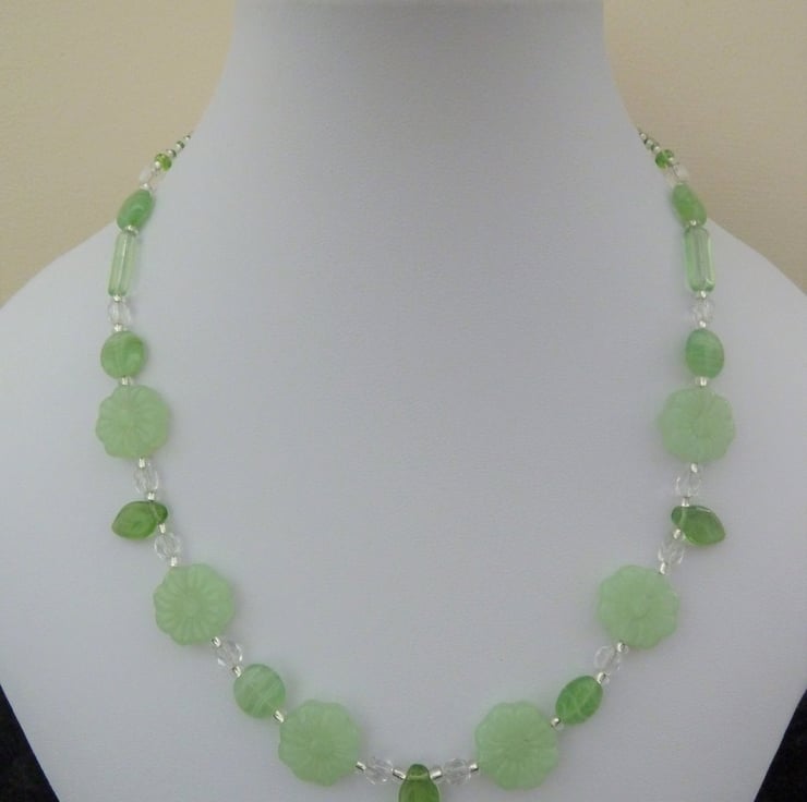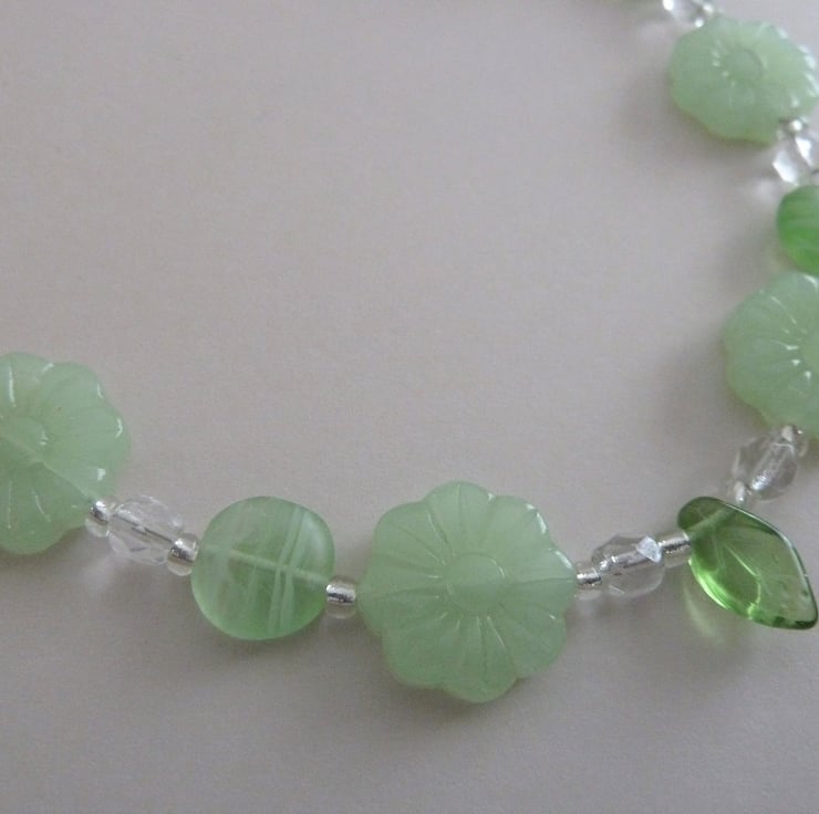 A necklace made using green glass flower beads, clear glass beads and green glass leaves.