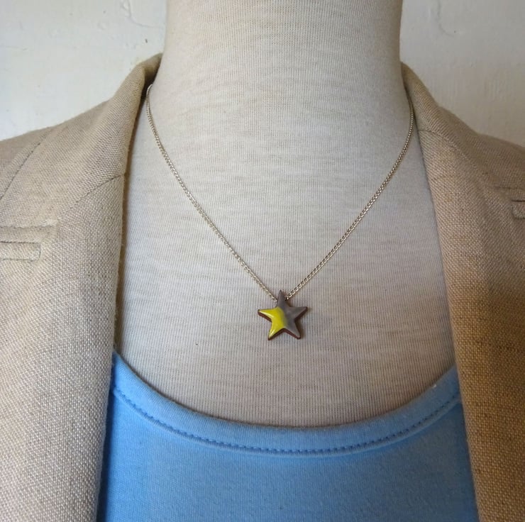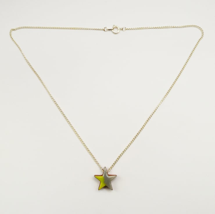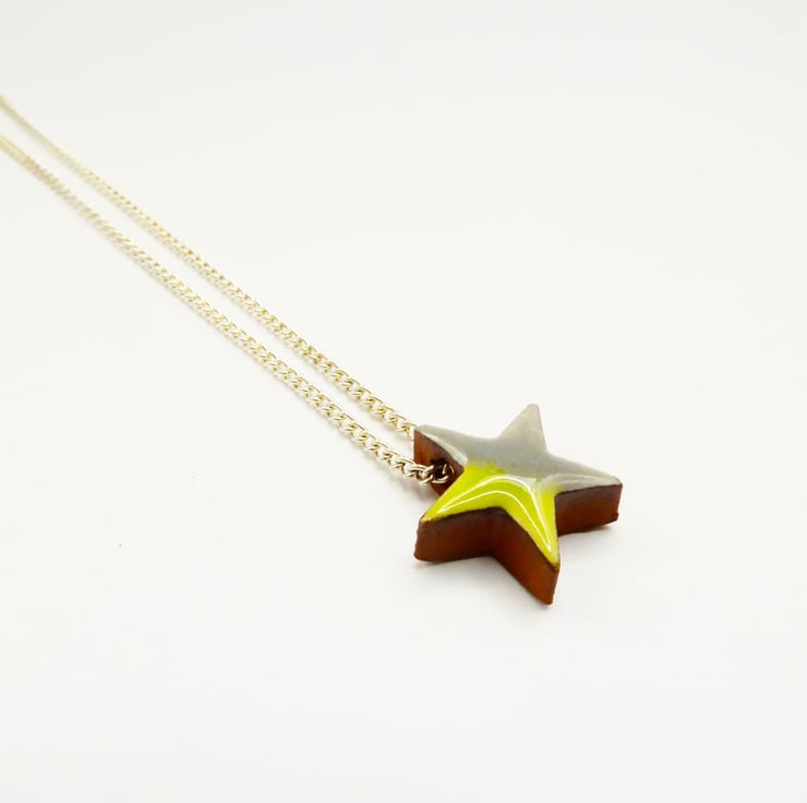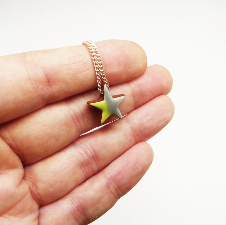 Star shaped pendent necklace made from a deep red terracotta clay and glazed on one surface in lime green and grey asymmetric design. The pendant has a hole through the ceramic so that the pendant hangs directly from the chain to give a clean modern look. The chain is a silver plated 16 inch curb chain with a spring ring fastener.