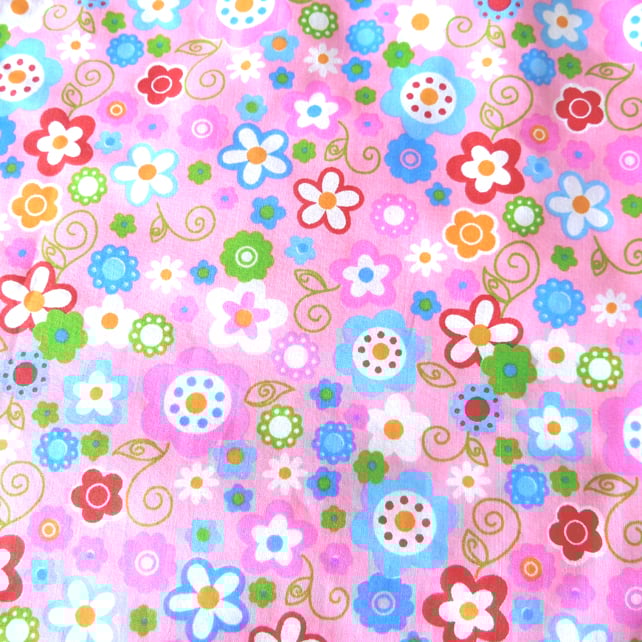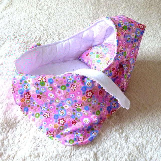 This pretty doll's carrycot is made from pink multi coloured polyester cotton which has a floral design the lining is made from white broderie anlglaise