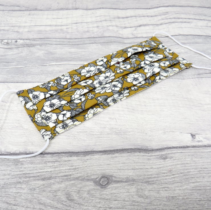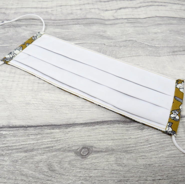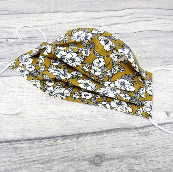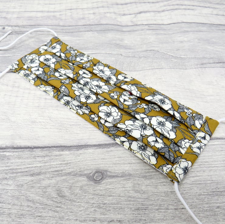 A re-useable face mask handmade in a cotton print featuring an ivory floral motif on a mustard background. The mask is made up of three layers of cotton, a patterned outer and a white inner and reverse layer. It's generously sized at 22 cm x 8 cm (8 3/4" x 3") when flat and opens out to completely cover the mouth and nose. I have threaded soft round elastic through the side channels which I have left for you to knot and trim in order to get the best fit.