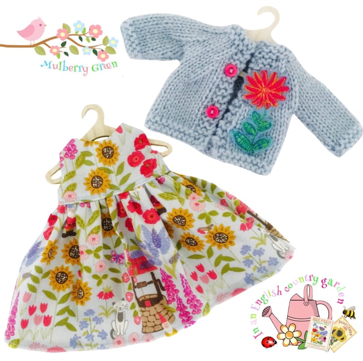 A really sweet little blue dress covered in flowers, a little wishing well and the garden cat to fit the Mulberry Green characters. The dress is made from best quality cotton, has a full skirt and a lined bodice and is part of the English Country Garden collection. It comes on a cute little wooden hanger. It matches the ‘Down at the Bottom of the Garden’ cardigan.