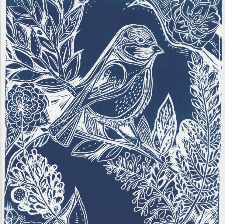 A4 Linocut print of a Blue tit bird amongst a leafy, floral background.