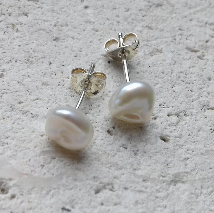 White baroque pearl studs with sterling silver posts and butterflies - a delightfully wonky take on a classic pearl.