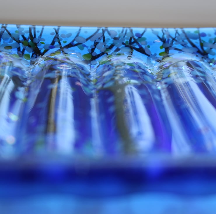 This beautiful ribbed fused glass soap dish is made from 2 sheets of glass which are decorated with hand drawn trees and then fused in the kiln with the addition of small pieces of coloured glass. The resulting glass panel is then fired a second time over a mould in order to create the ribs in the glass.