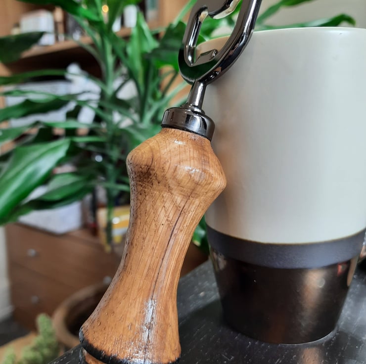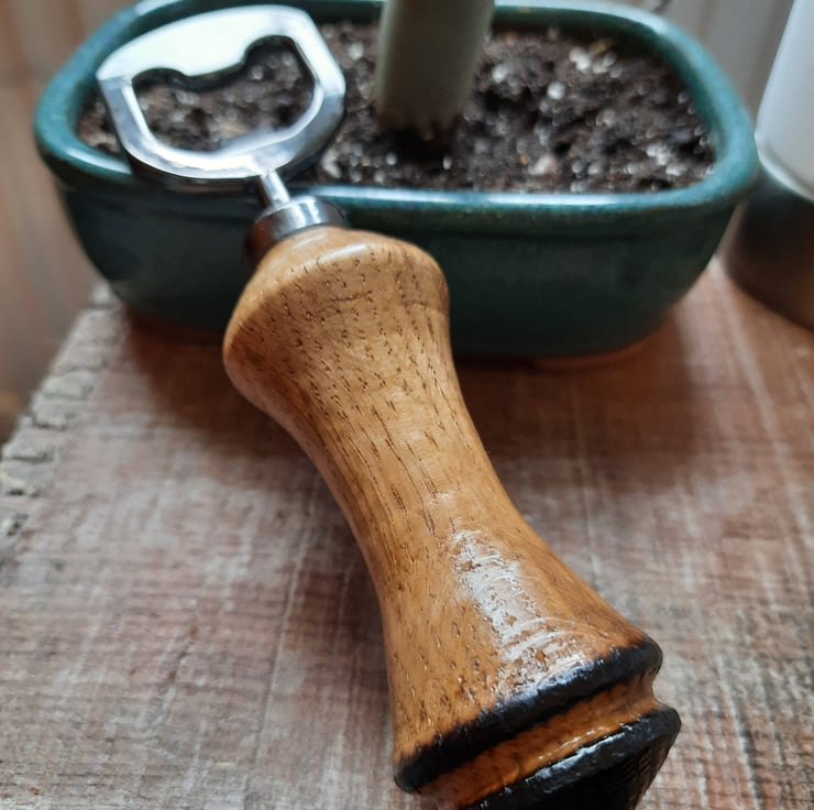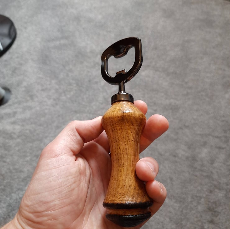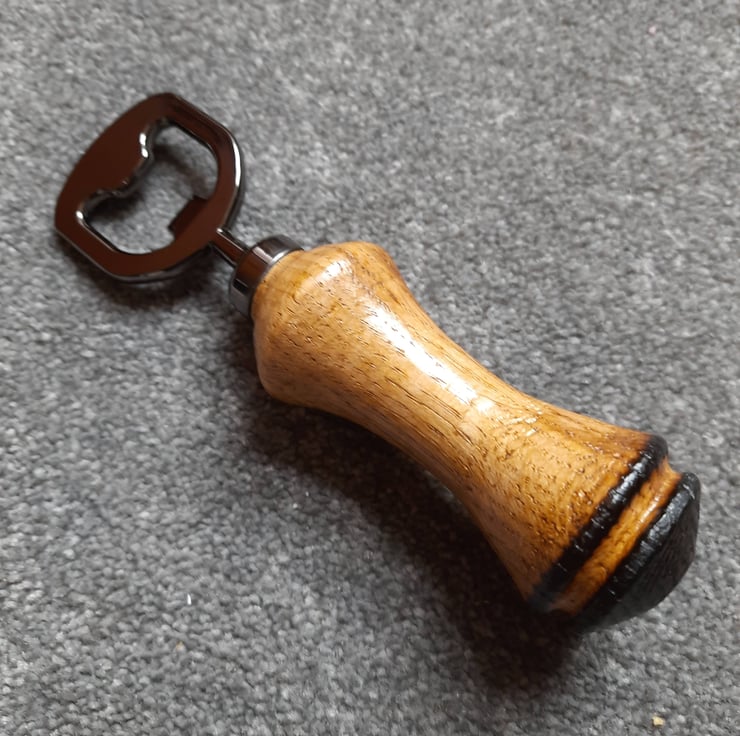 This is a beautiful handmade bottle opener. Turned from a single piece of oak, this bottle opener has a charred end to give it a unique touch. Thanks to its ergonomic shape and ridged detailing this opener feels fantastic in the hand and will add style and class to any kitchen. The hardware is metal and with a black chrome finish.