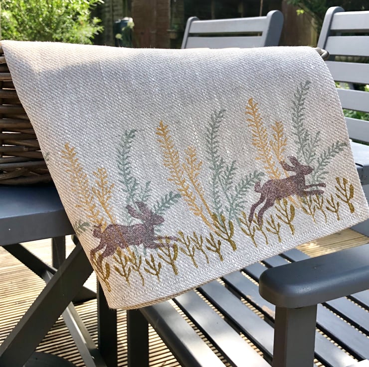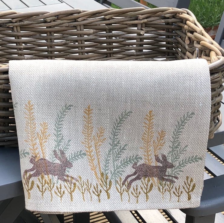 This country kitchen style tea towel has been made from a quality linen fabric which I have block stamped with a typical countryside theme.