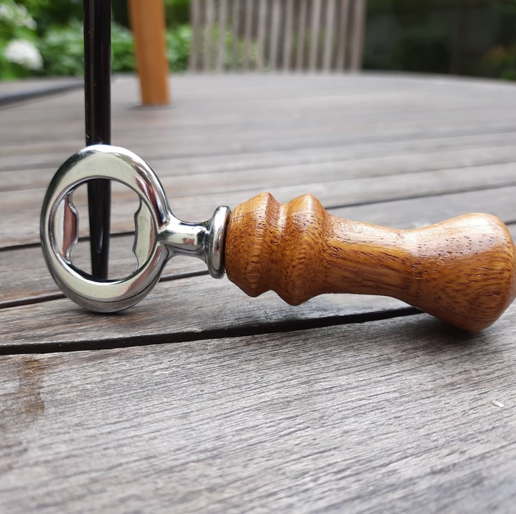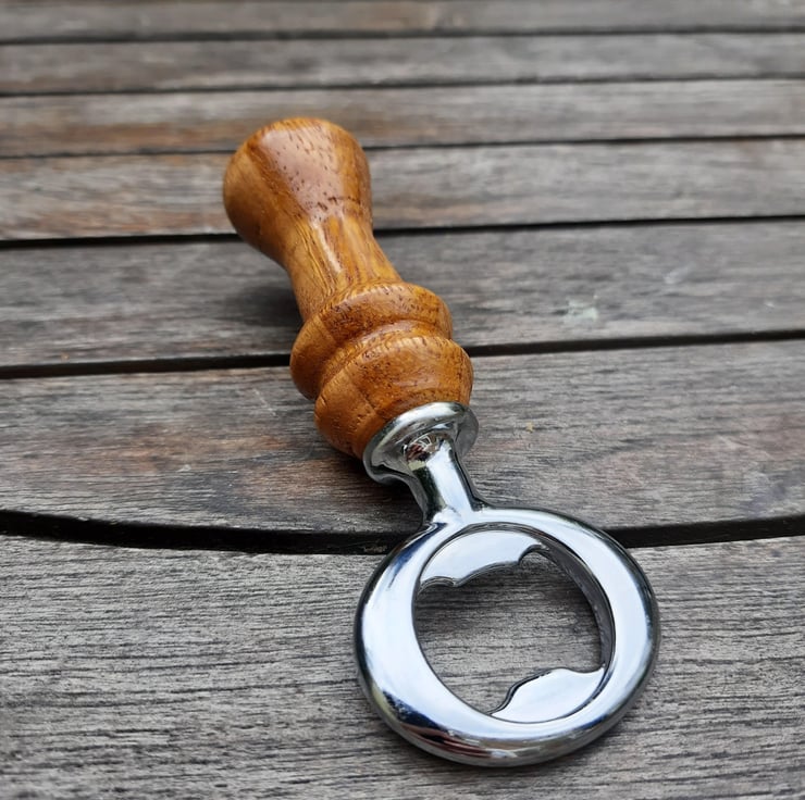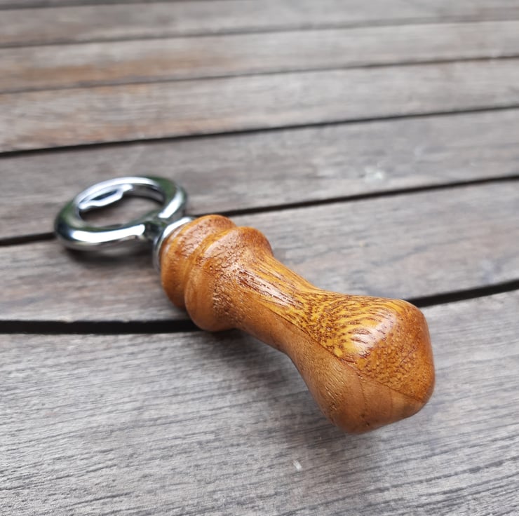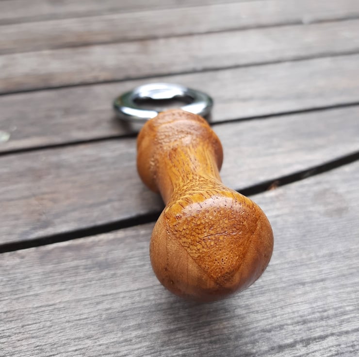 This is a handmade, woodturned bottle opener, made using exotic hardwoods Mango and Cherry, which are joined in opposing quarters to give a unique and interesting pattern. The grain on the woods is stunning! This opener has a lovely compact and ergonomic shape and would be an amazing gift for any beer lover!