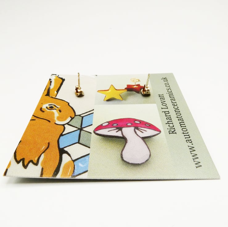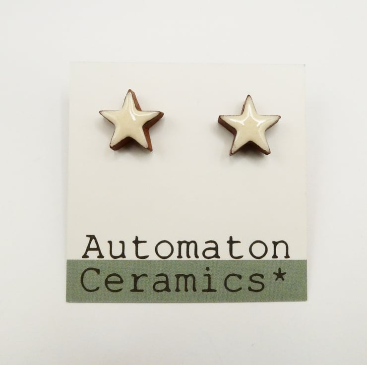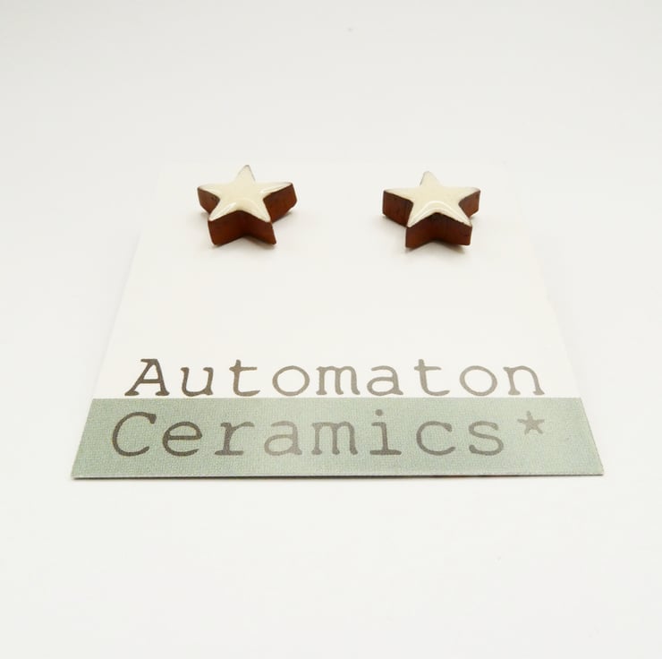 These star shaped stud earrings are made from a dark red terracotta clay which is glazed on the top surface in a cool white glaze. This gives a great combination of textures. The stud backs and scroll are silver plate.