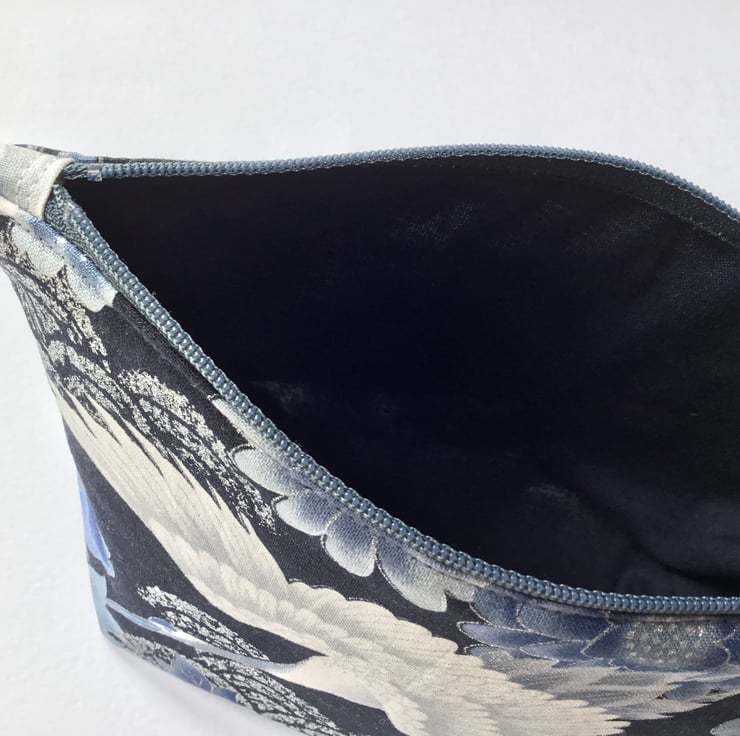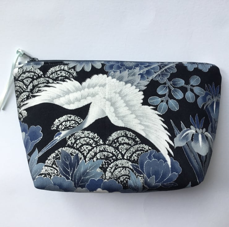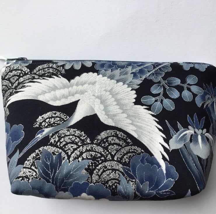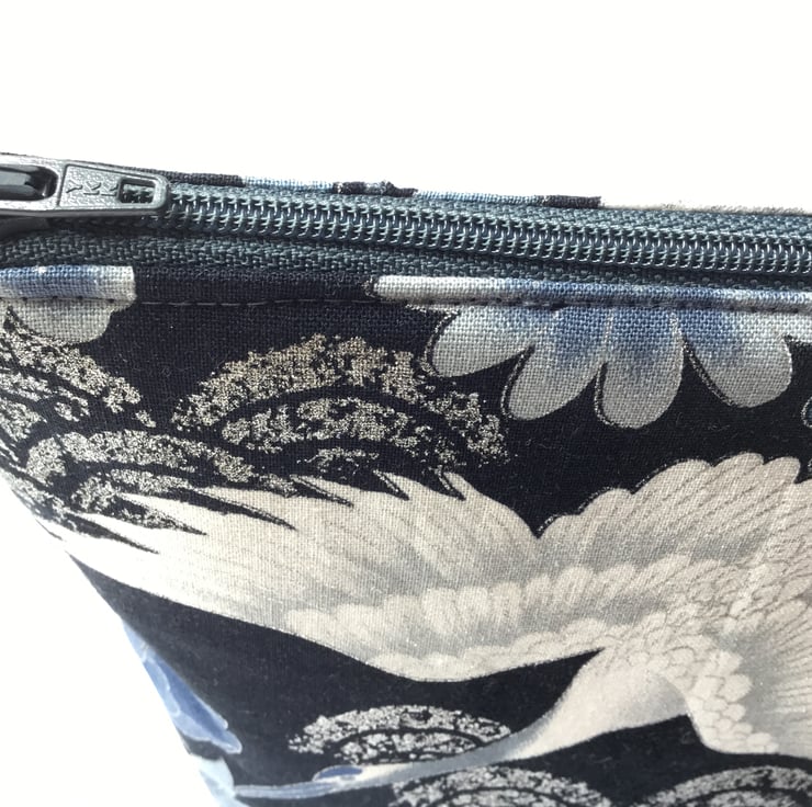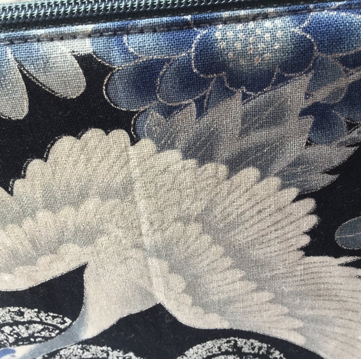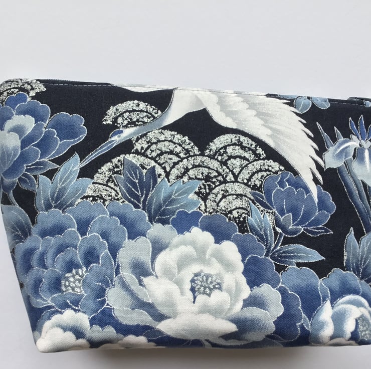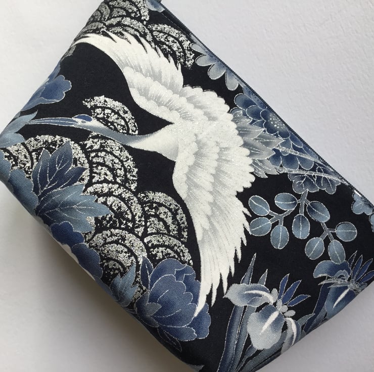 Japanese fabric with sparkling silver threads on the cranes and flowers make this a beautiful make up bag, or pouch for holding essentials. I have used a YKK zipper and lined it in a navy cotton, and used a fleece interfacing for body. The corners are boxed to make it stand up. The size is approximately 9”x6.5”